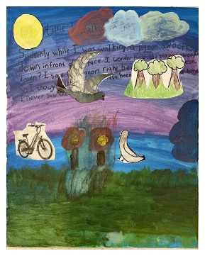 My art is about a walk in the park but suddenly a bird swooped down in front of my face. I did not like that, the bird was too close to me for a second. The point of my piece of art is because I find it funny when the bird swoops down. My art piece shows that there is another bird and I added the other bird because when I turned to look at the side I saw another bird, so that is why I put 2 birds in my picture.