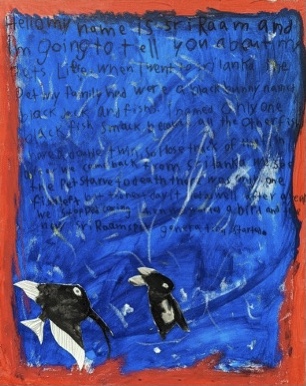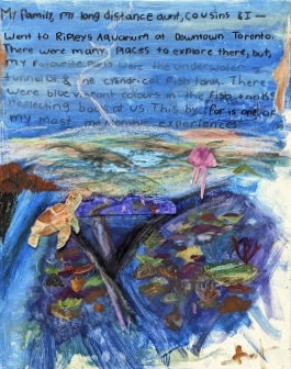 This painting is about when I went to Lake Pickering. This is important to me because, I love swimming and I think the colours on it look very vibrant and makes me want to explore under the sea. That is because the coral under the sea is very colourful and it makes me feel happy. I also like the fish because it shows me wildlife.
