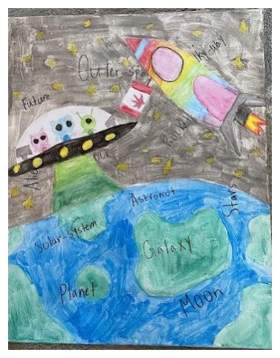 My art takes place with outer space art pieces and I was inspired by my childhood.I would draw aliens and space things when I was bored. I drew this piece because space to me is a beautiful and a quiet place., I thought about aliens and I drew them down as me and my siblings. I made each of my siblings into each alien. They are unique in a way. My, art piece has a Canada flag because that is my home country and I want to acknowledge that. I was thinking about the future of science in space while I was drawing.