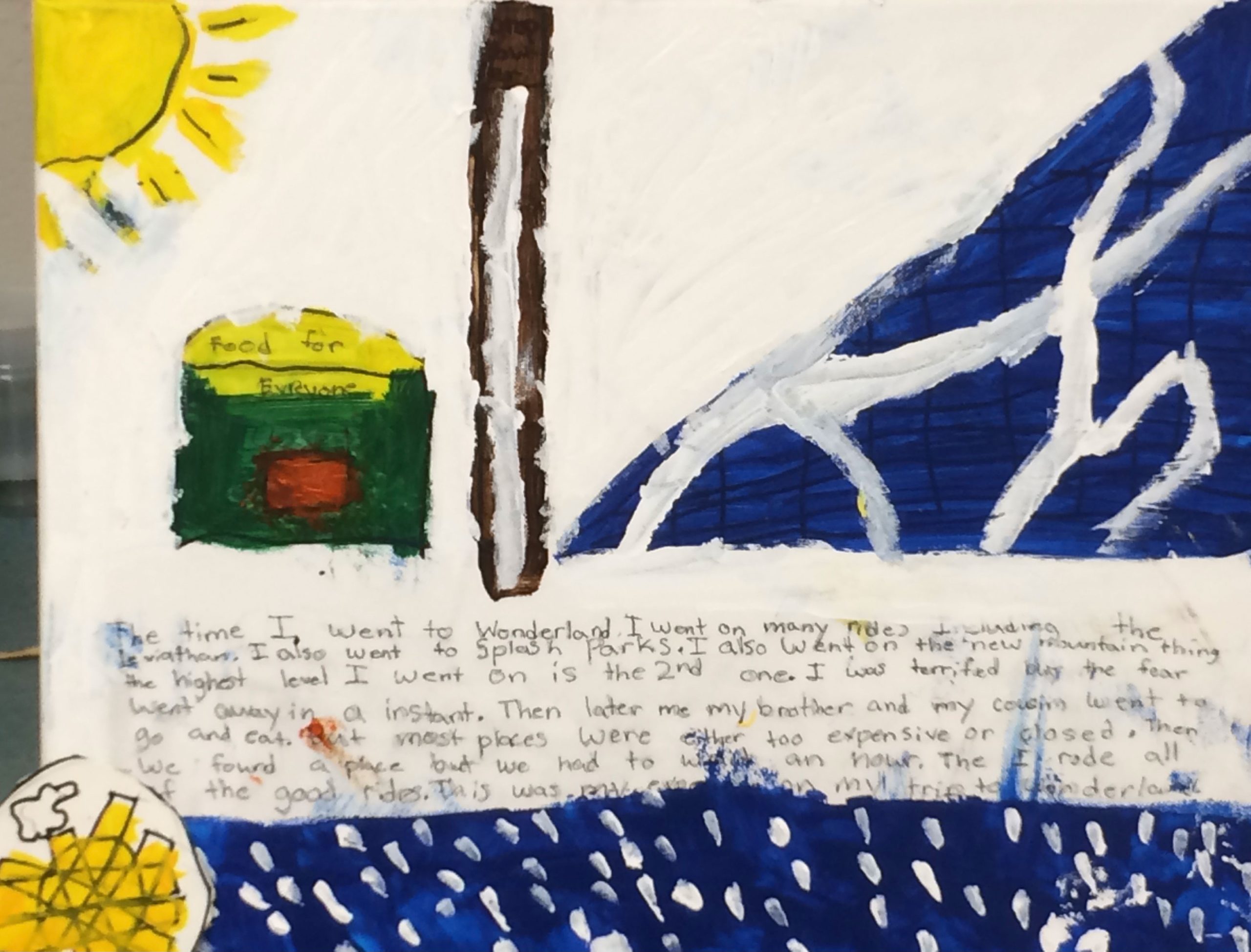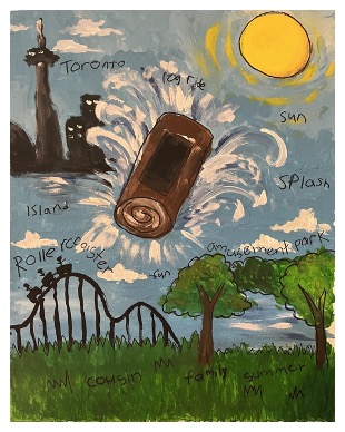 My art is about me and my family going to Center Island. I drew Center Island because it was a fun place to go to and me and our cousins love going there. I drew a log ride because it was me and my cousin’s favorite ride. The CN Tower was in the painting because we had to go to Toronto. The the sun was in the painting because it was summer and the sun was out. A roller coaster was there because Center Island had lots of roller coasters on the island. I drew splashes because the water splashes.