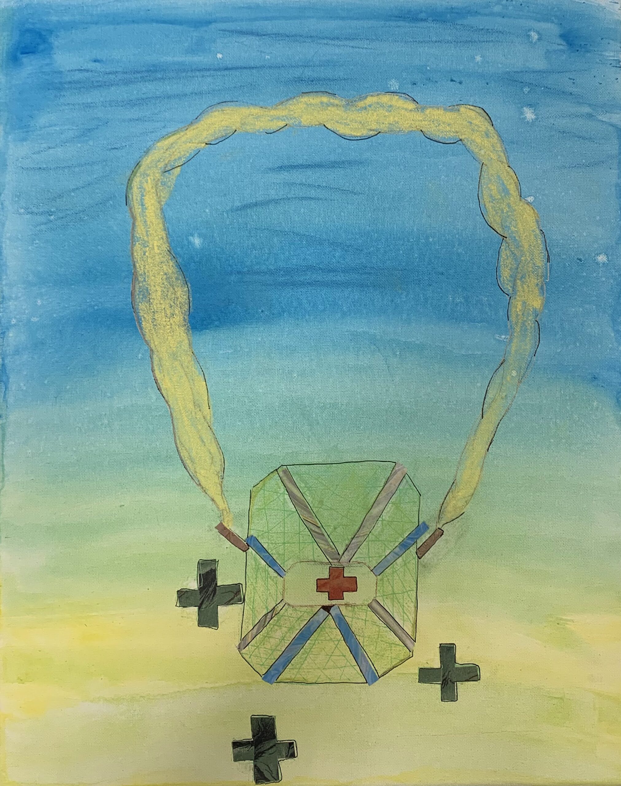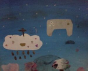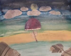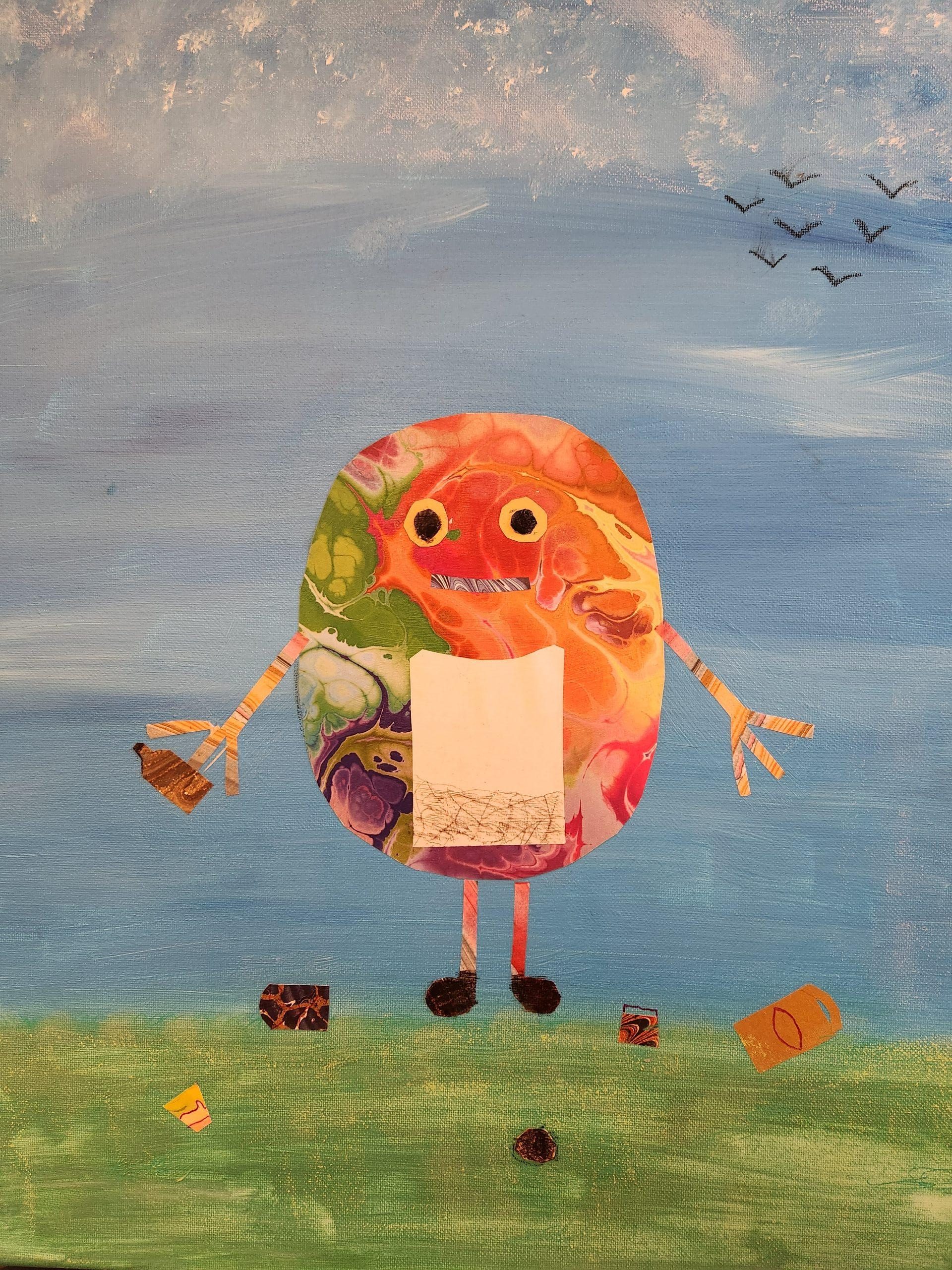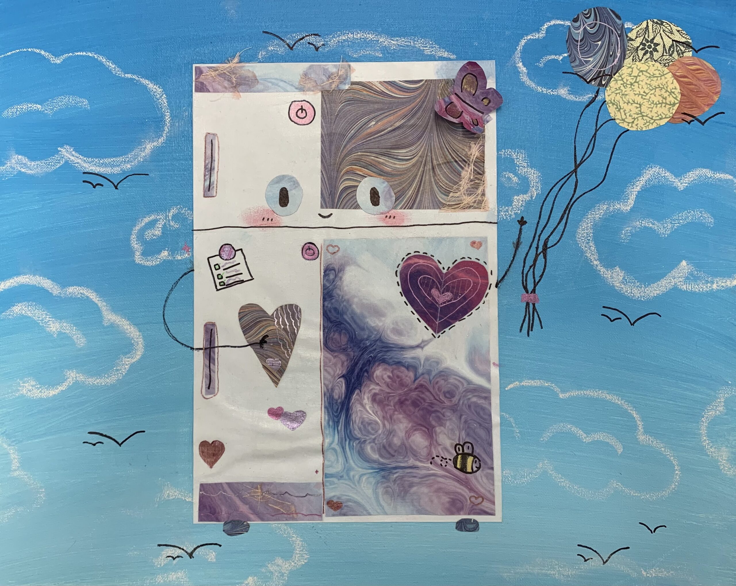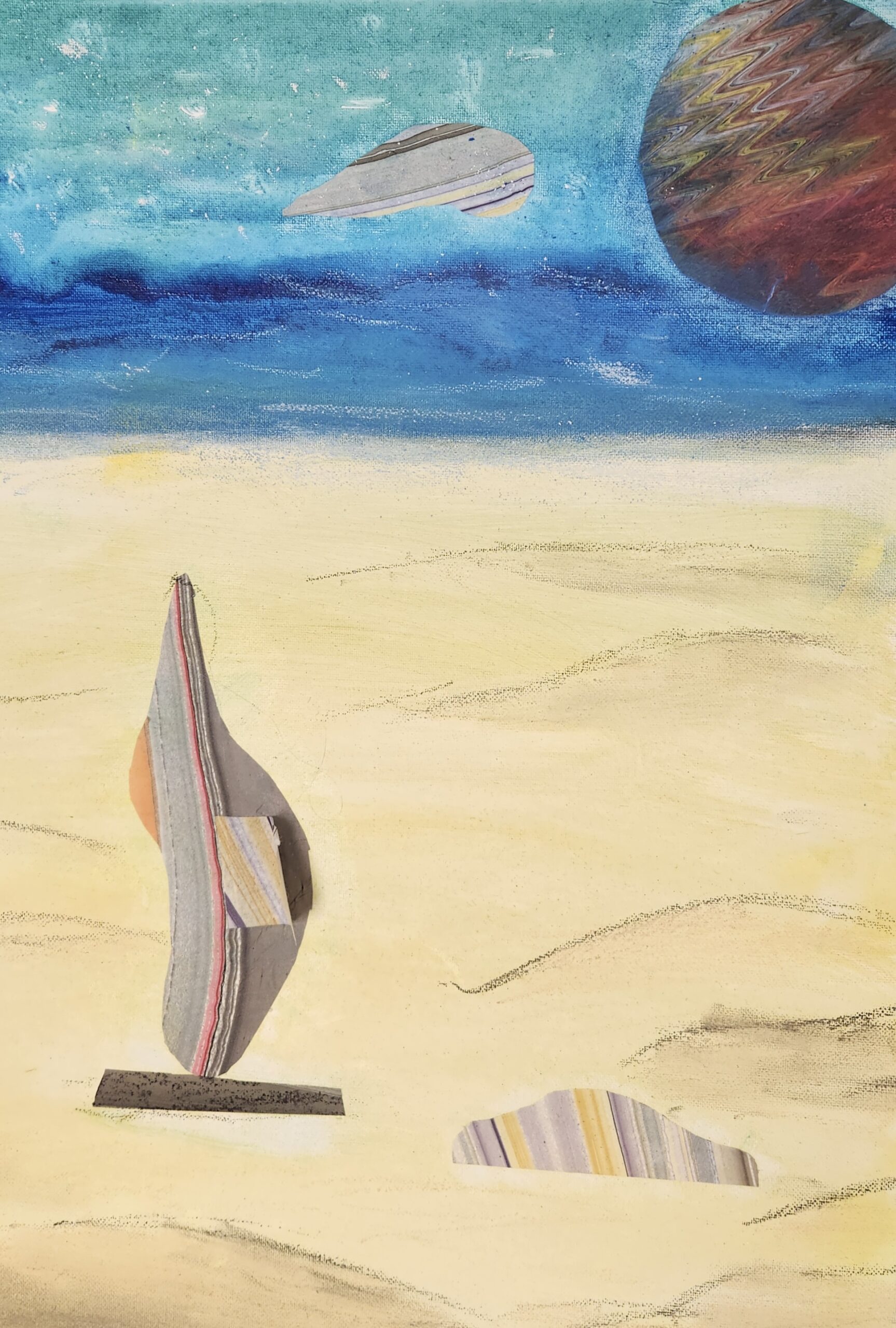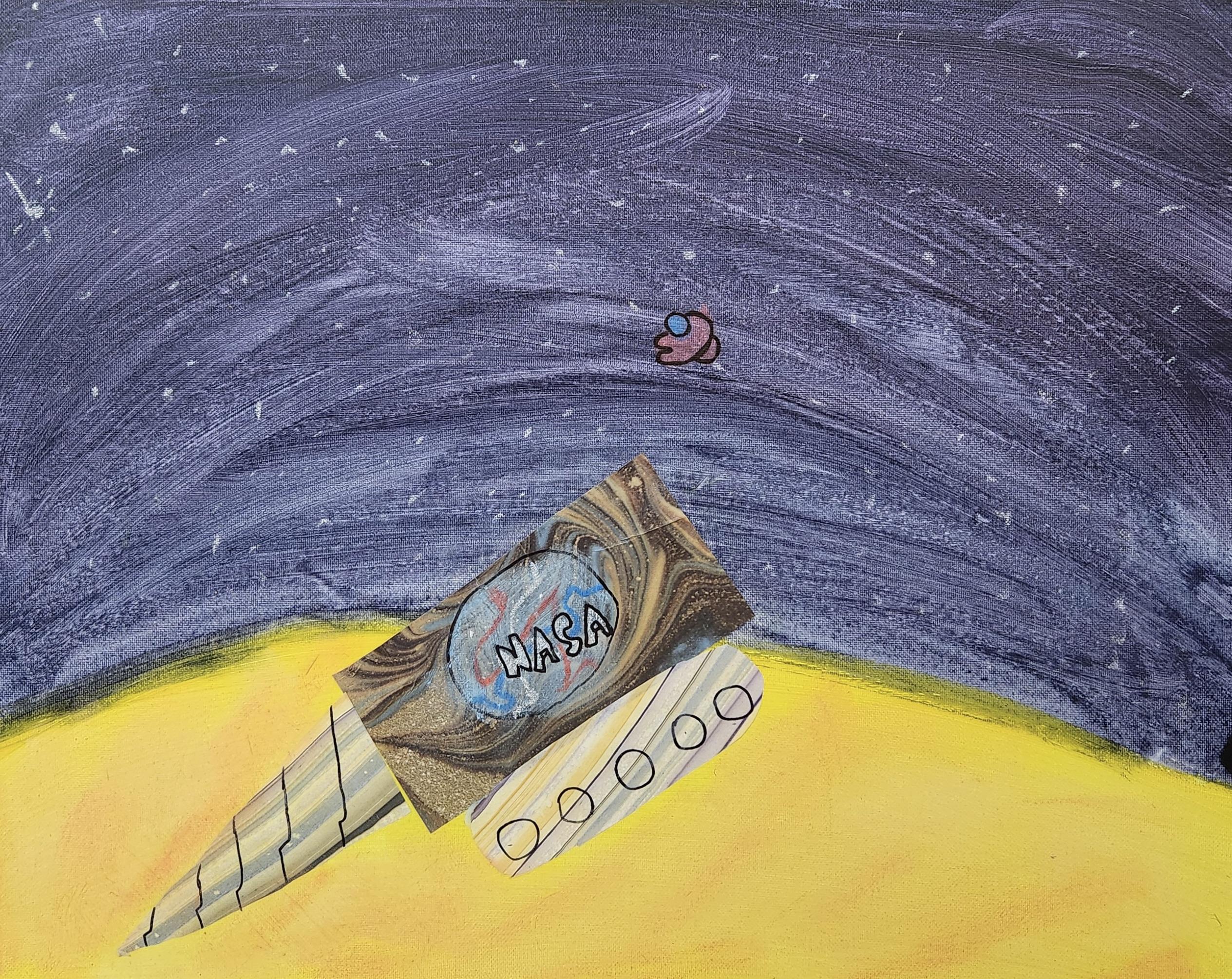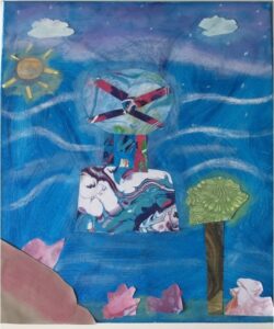 This painting is called “The Space Vase” created on February 14, 2023. The problem shown in my painting is overpopulation. To fix this problem, we created these “spaceships” that travel at the speed of light from one planet to another. My device carries humans from one planet to another with efficiency. It does not run on gas. Instead it runs on wind, kind of like a kite that can travel large distances without a rope