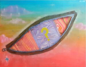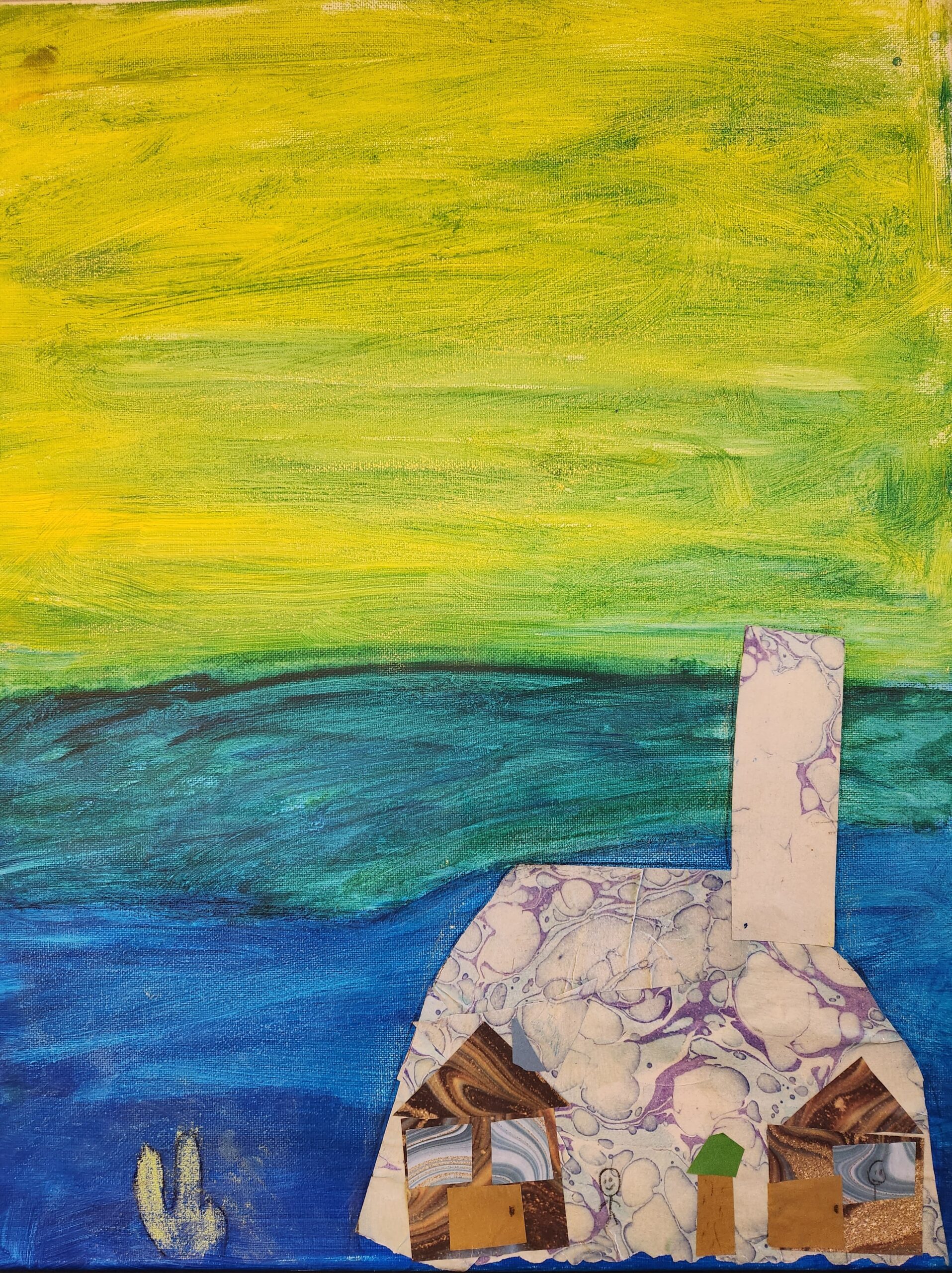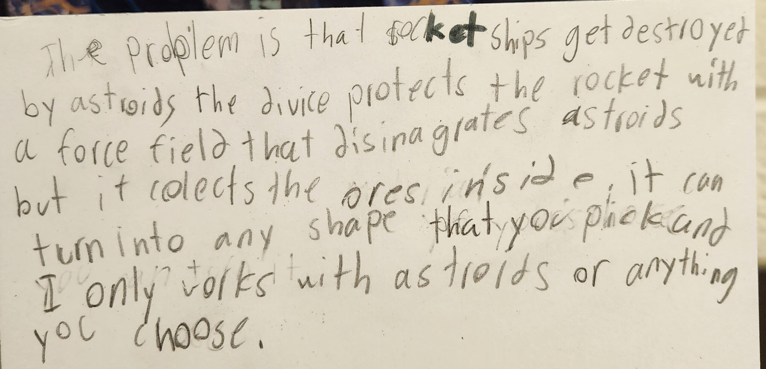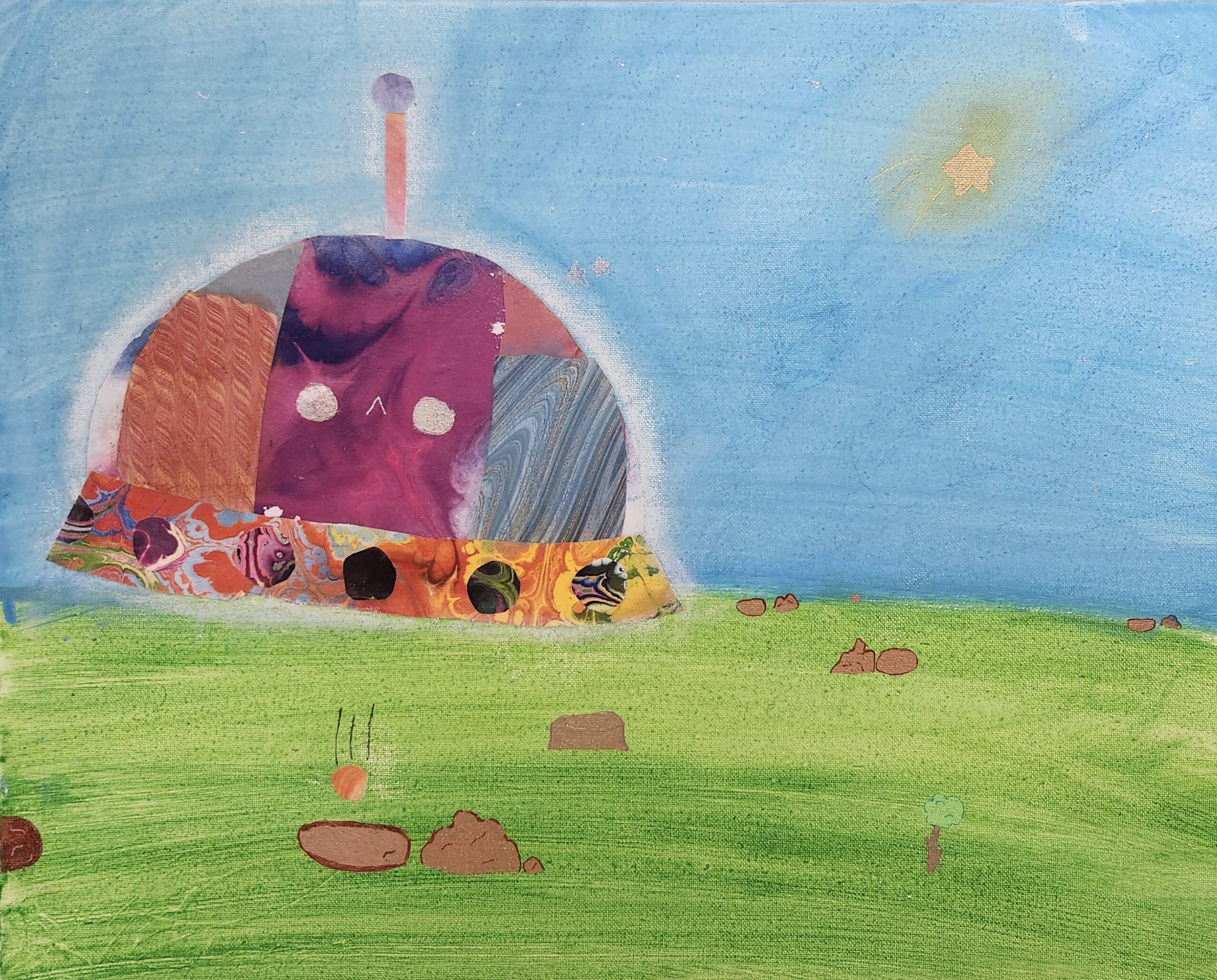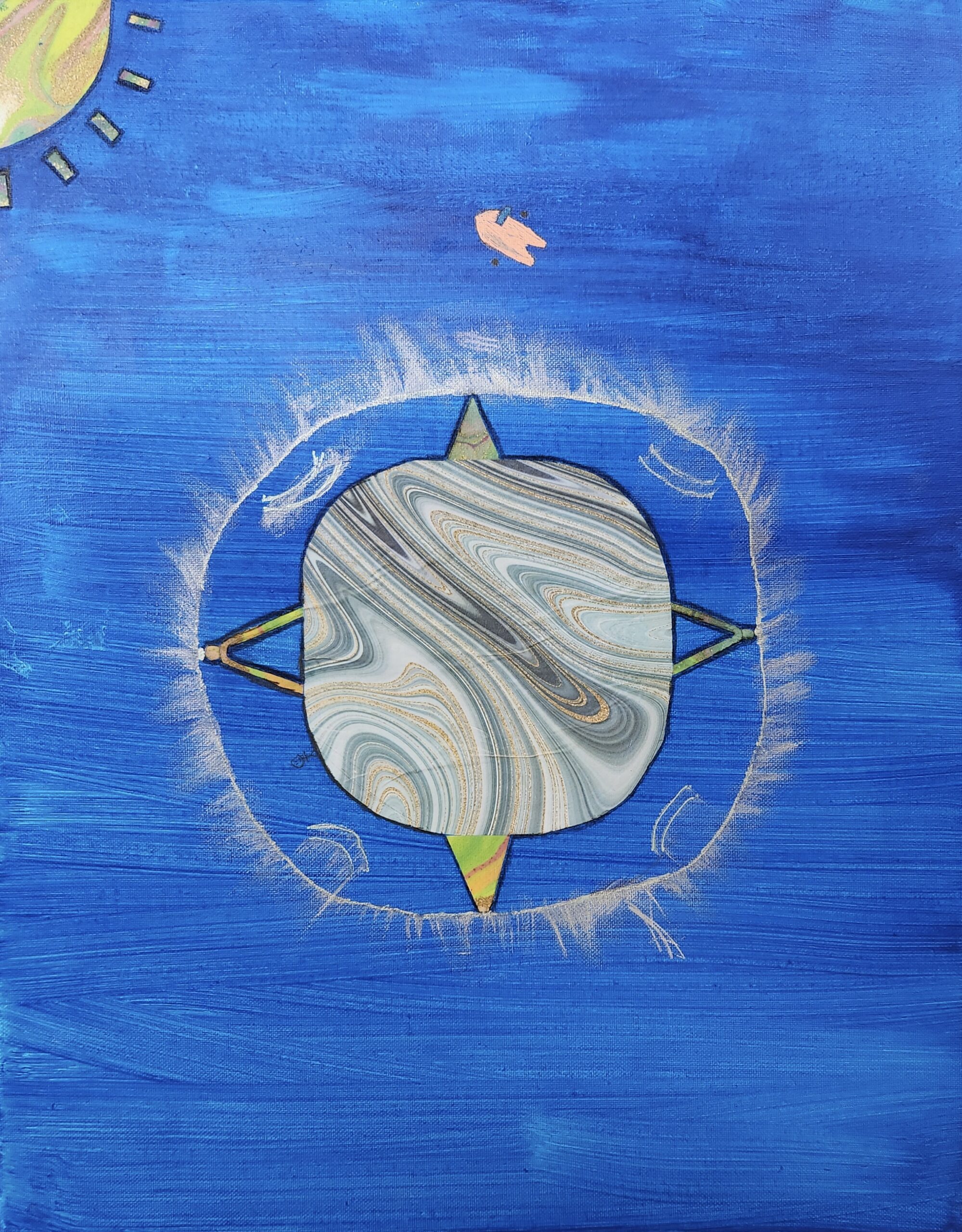 This painting is called “The Space Vase” created on February 14, 2023. The problem shown in my painting is overpopulation. To fix this problem, we created these “spaceships” that travel at the speed of light from one planet to another. My device carries humans from one planet to another with efficiency. It does not run on gas. Instead it runs on wind, kind of like a kite that can travel large distances without a rope