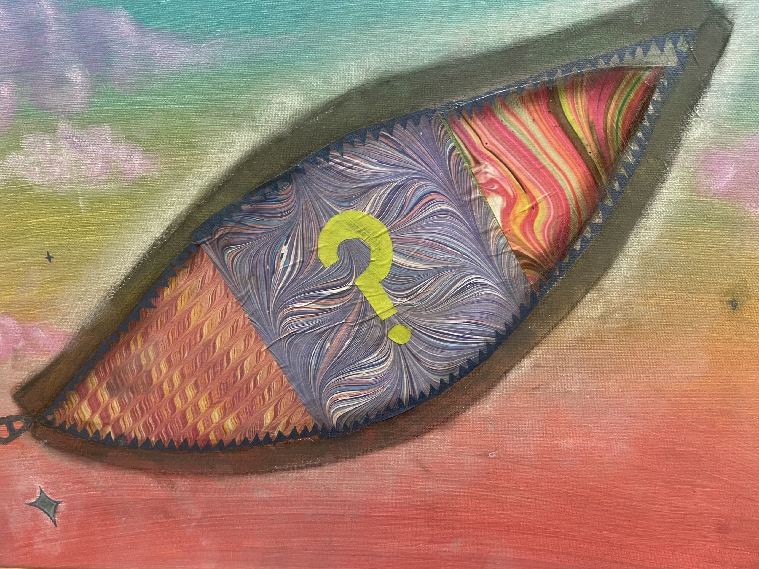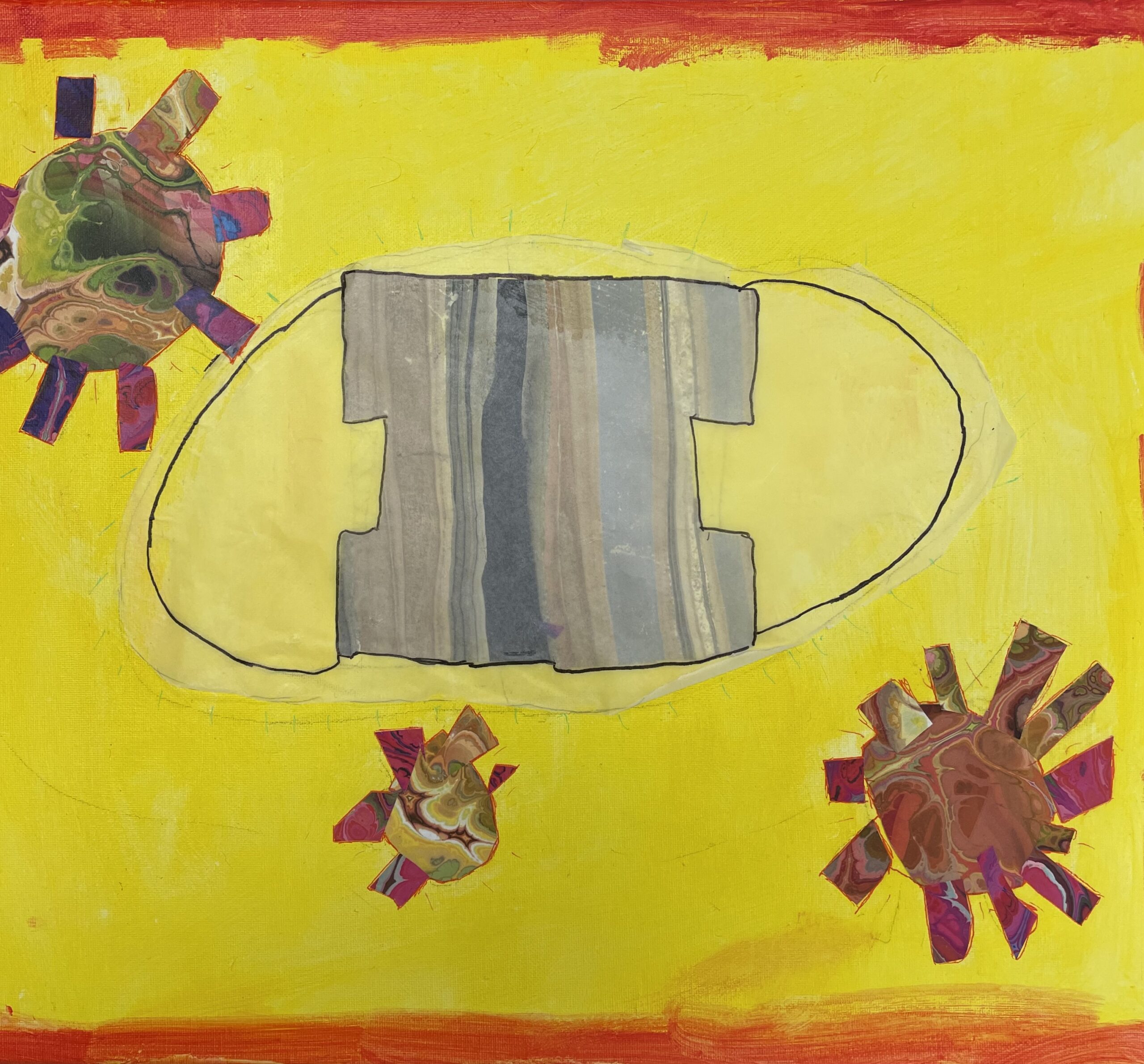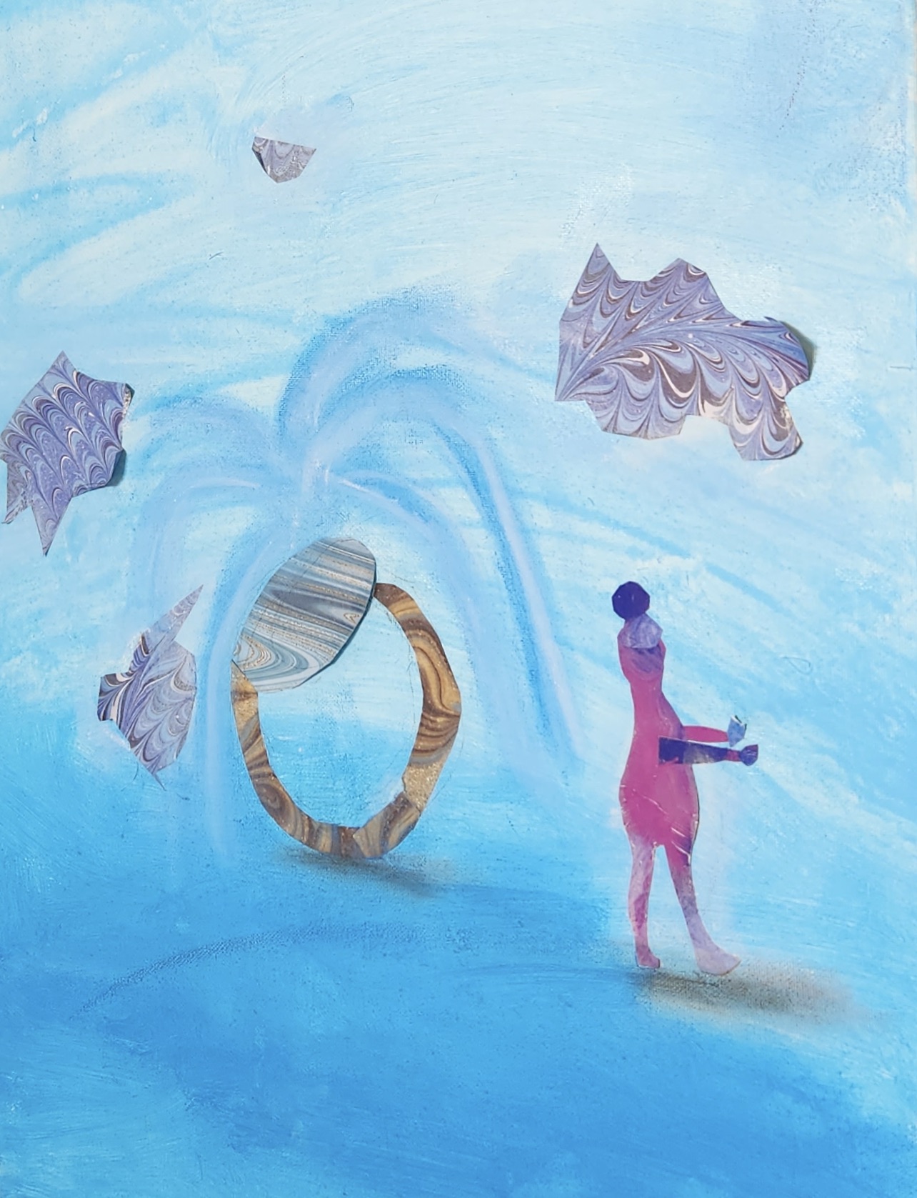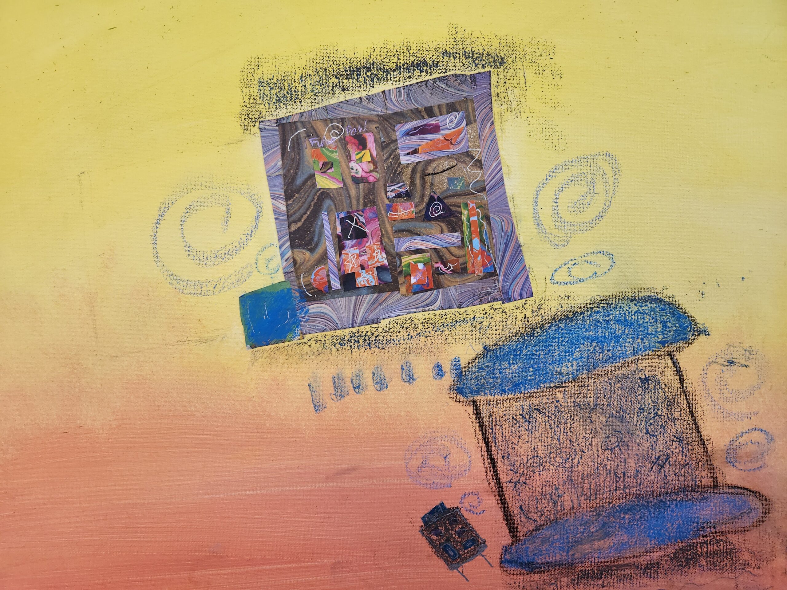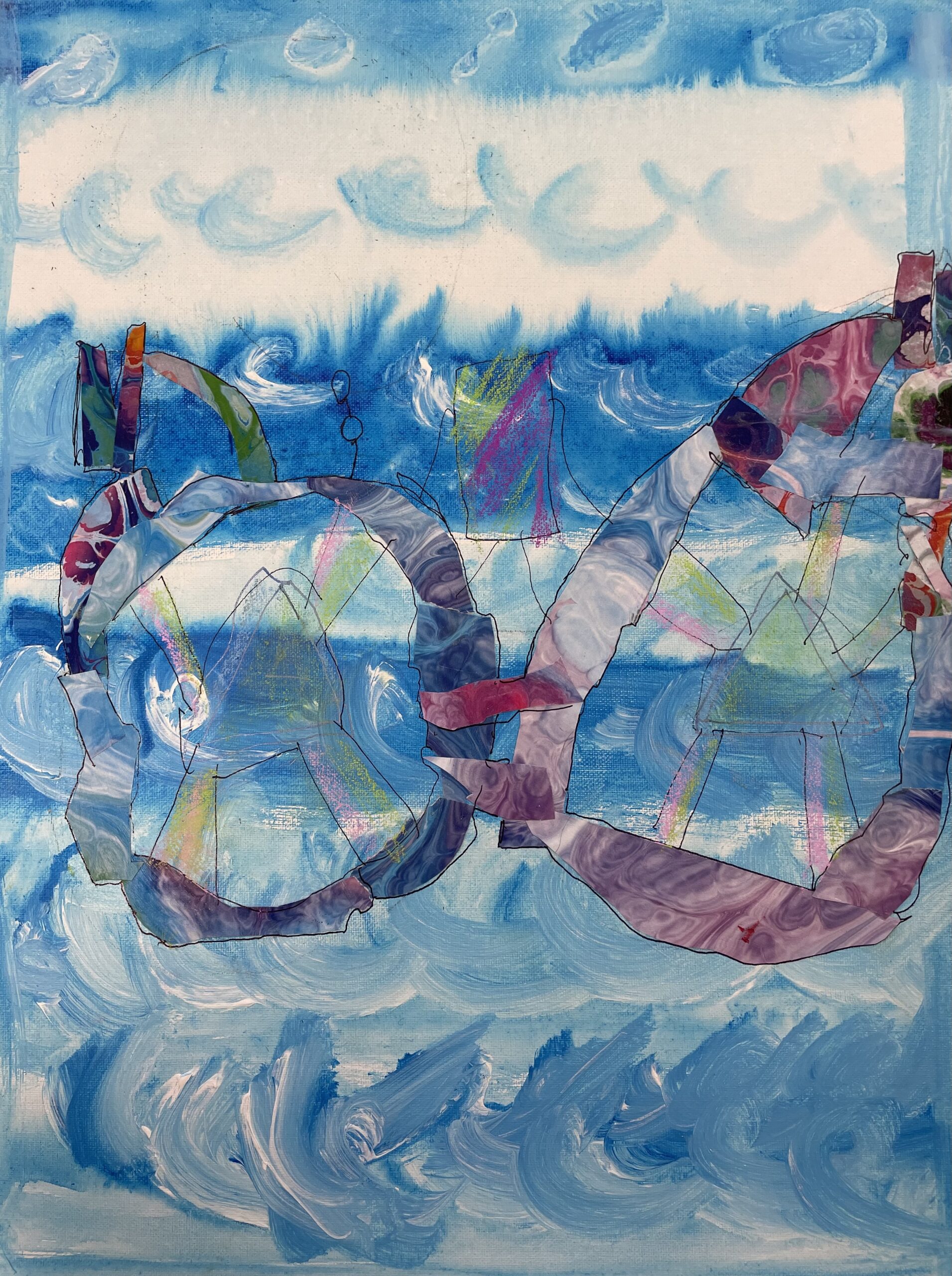 This painting is called “The Space Vase” created on February 14, 2023. The problem shown in my painting is overpopulation. To fix this problem, we created these “spaceships” that travel at the speed of light from one planet to another. My device carries humans from one planet to another with efficiency. It does not run on gas. Instead it runs on wind, kind of like a kite that can travel large distances without a rope