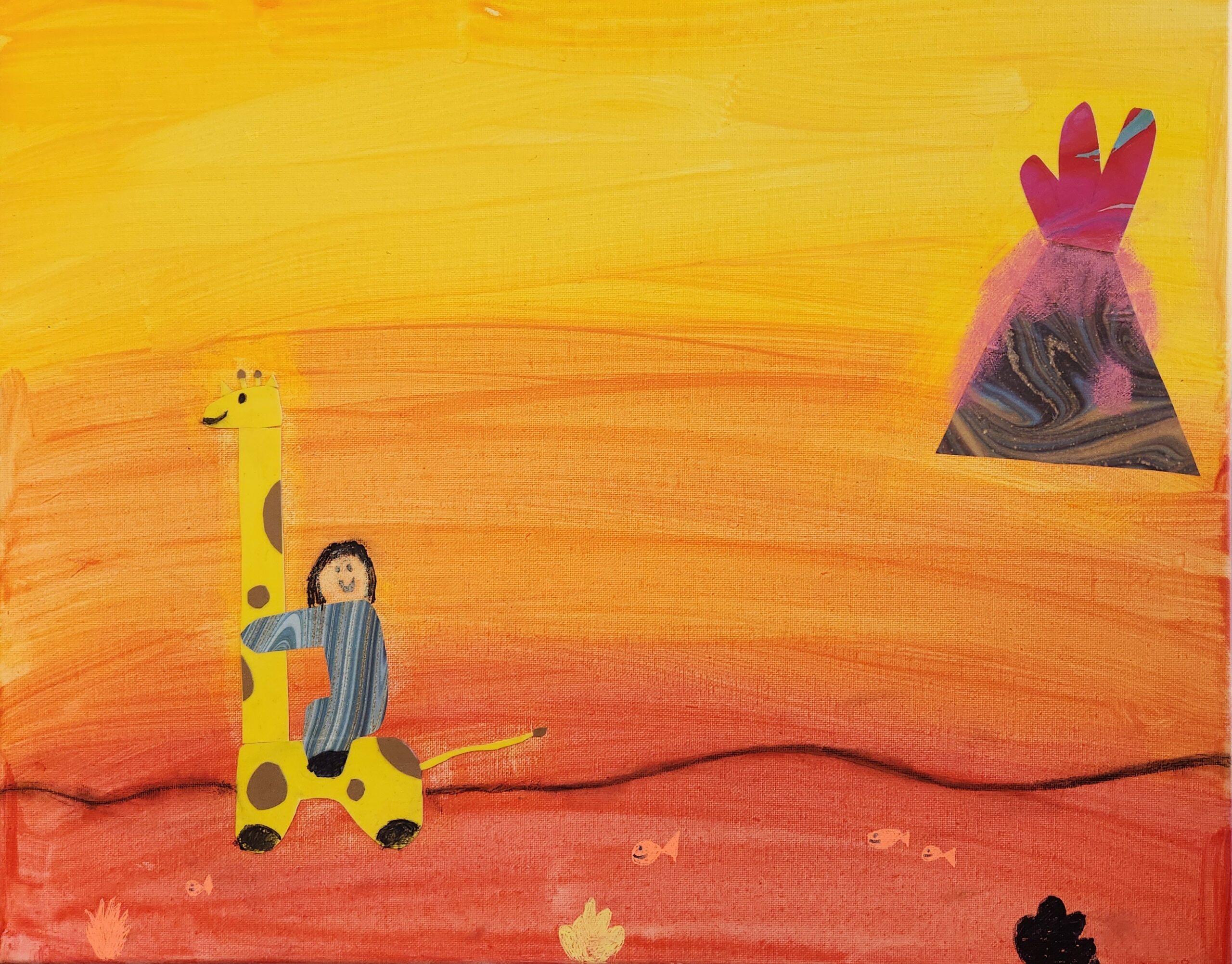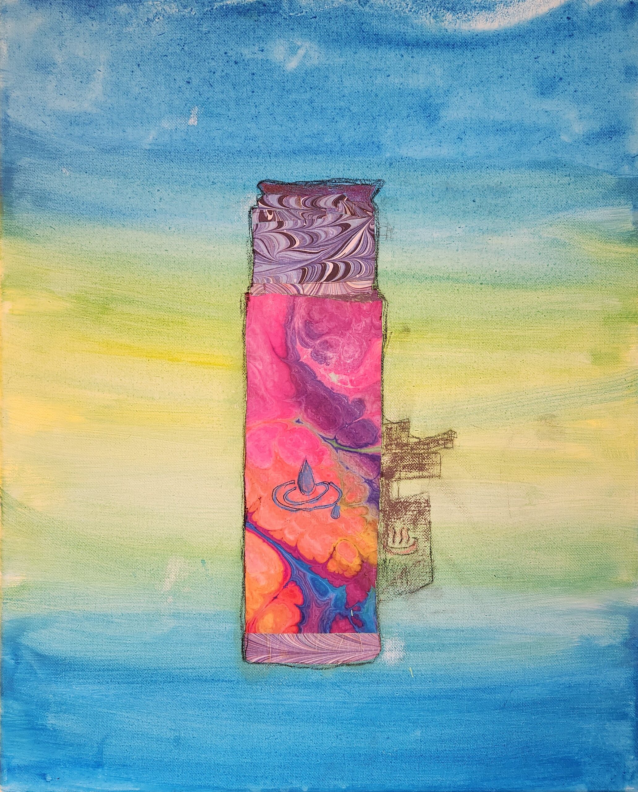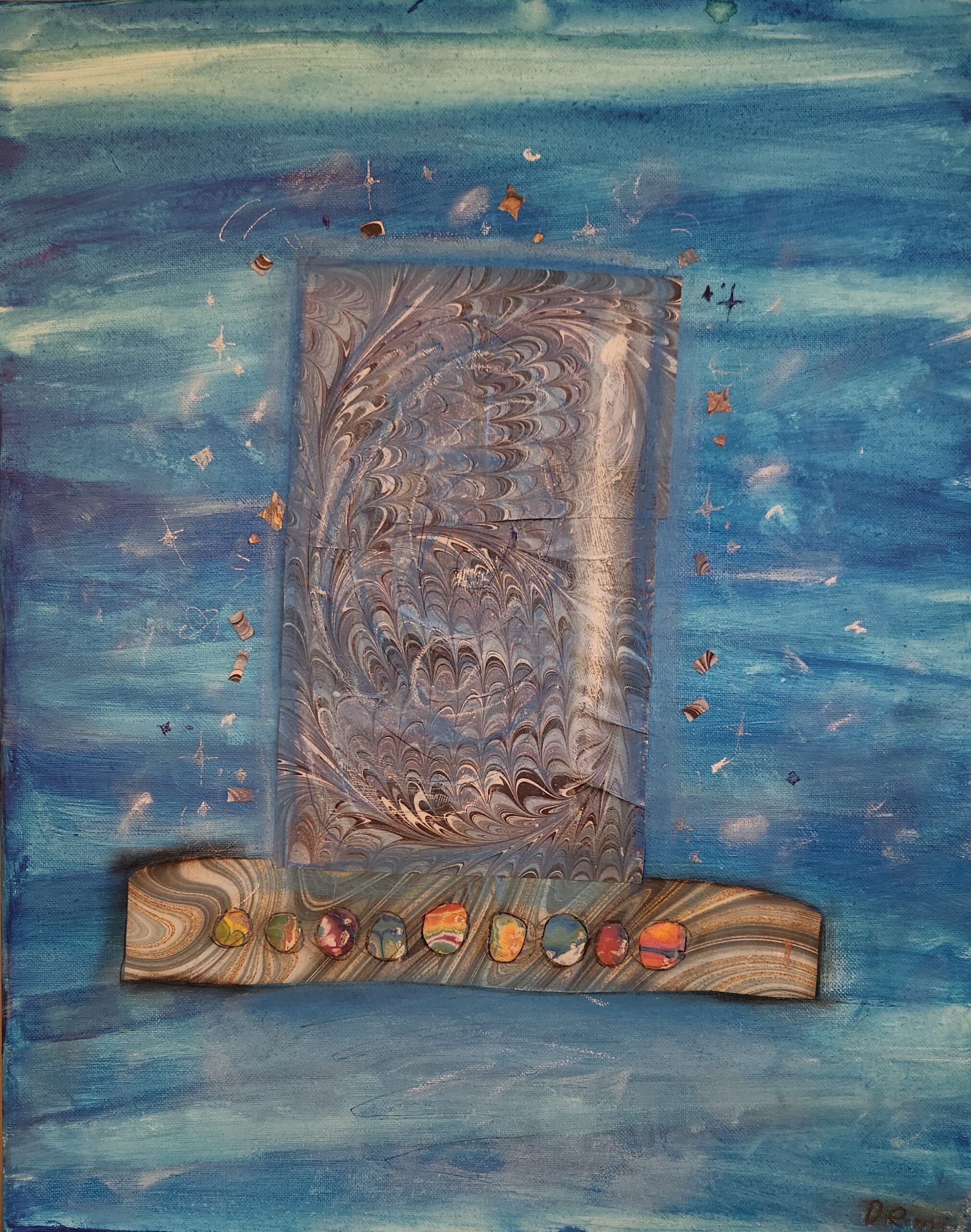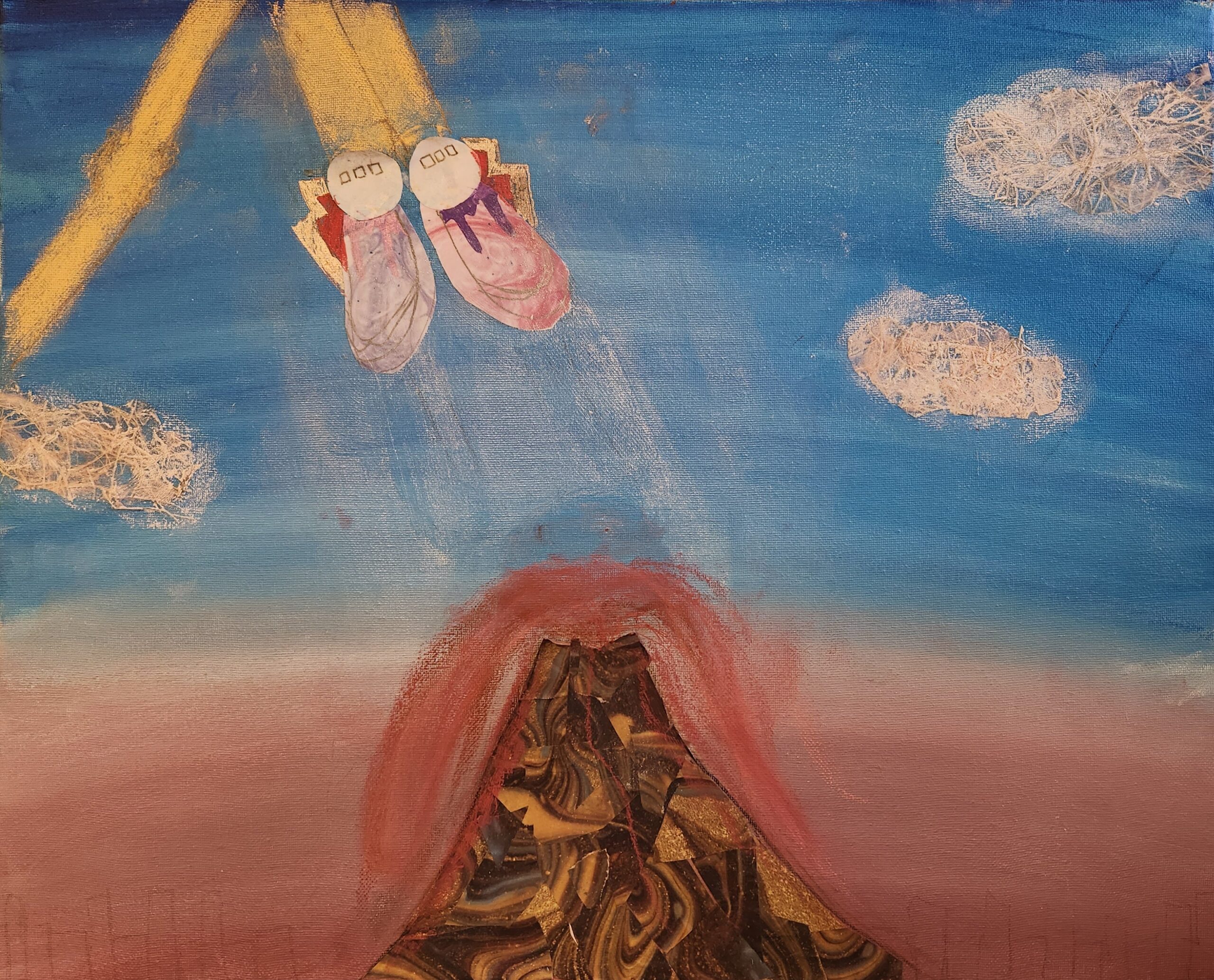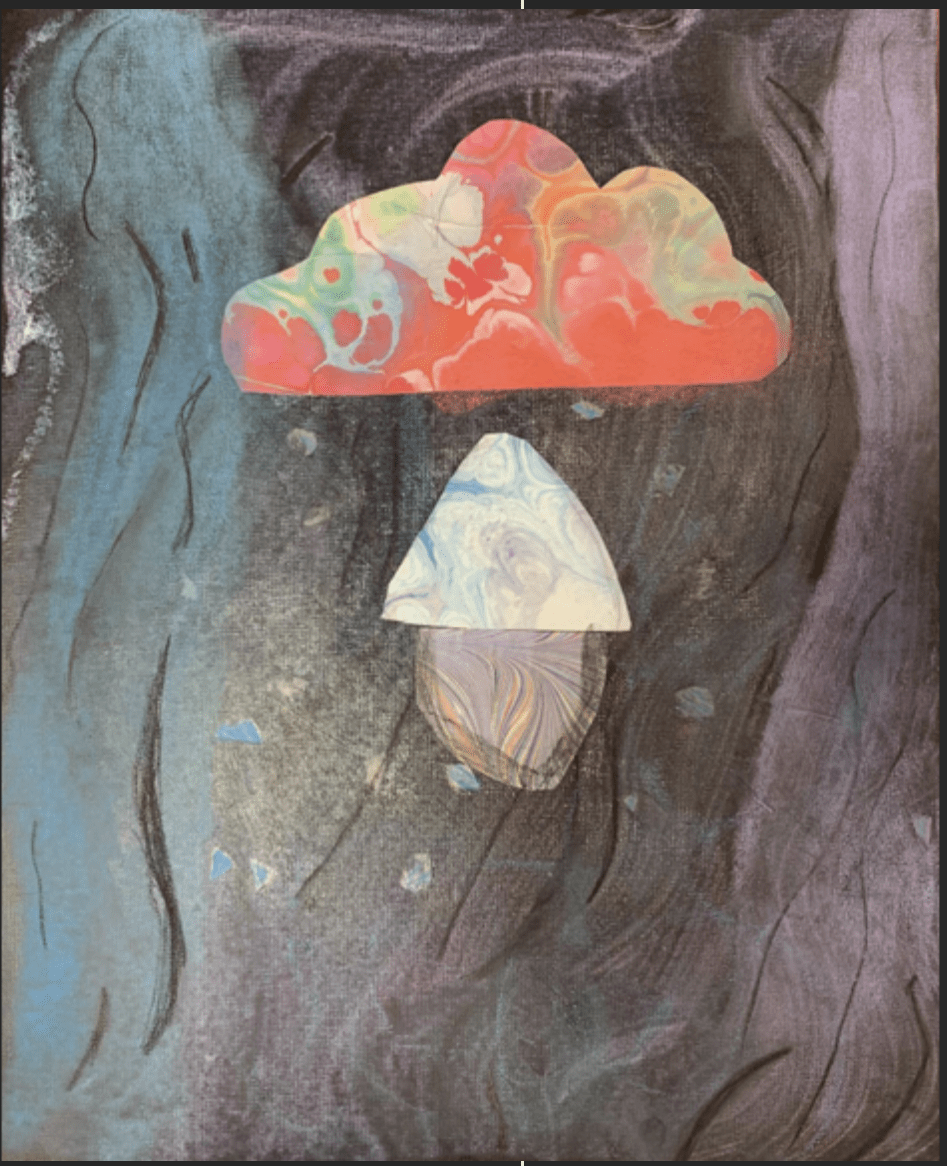 This painting is called “The Space Vase” created on February 14, 2023. The problem shown in my painting is overpopulation. To fix this problem, we created these “spaceships” that travel at the speed of light from one planet to another. My device carries humans from one planet to another with efficiency. It does not run on gas. Instead it runs on wind, kind of like a kite that can travel large distances without a rope