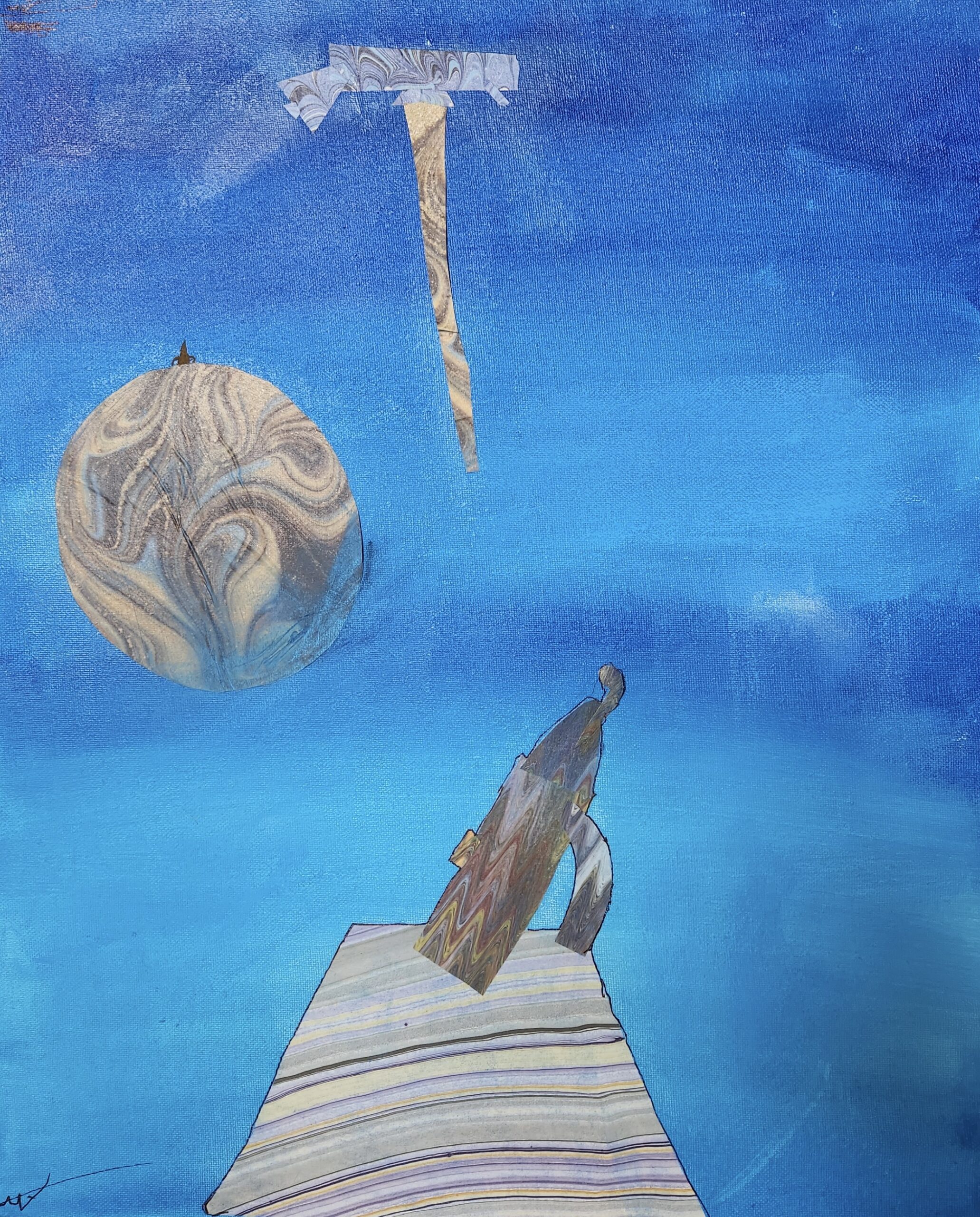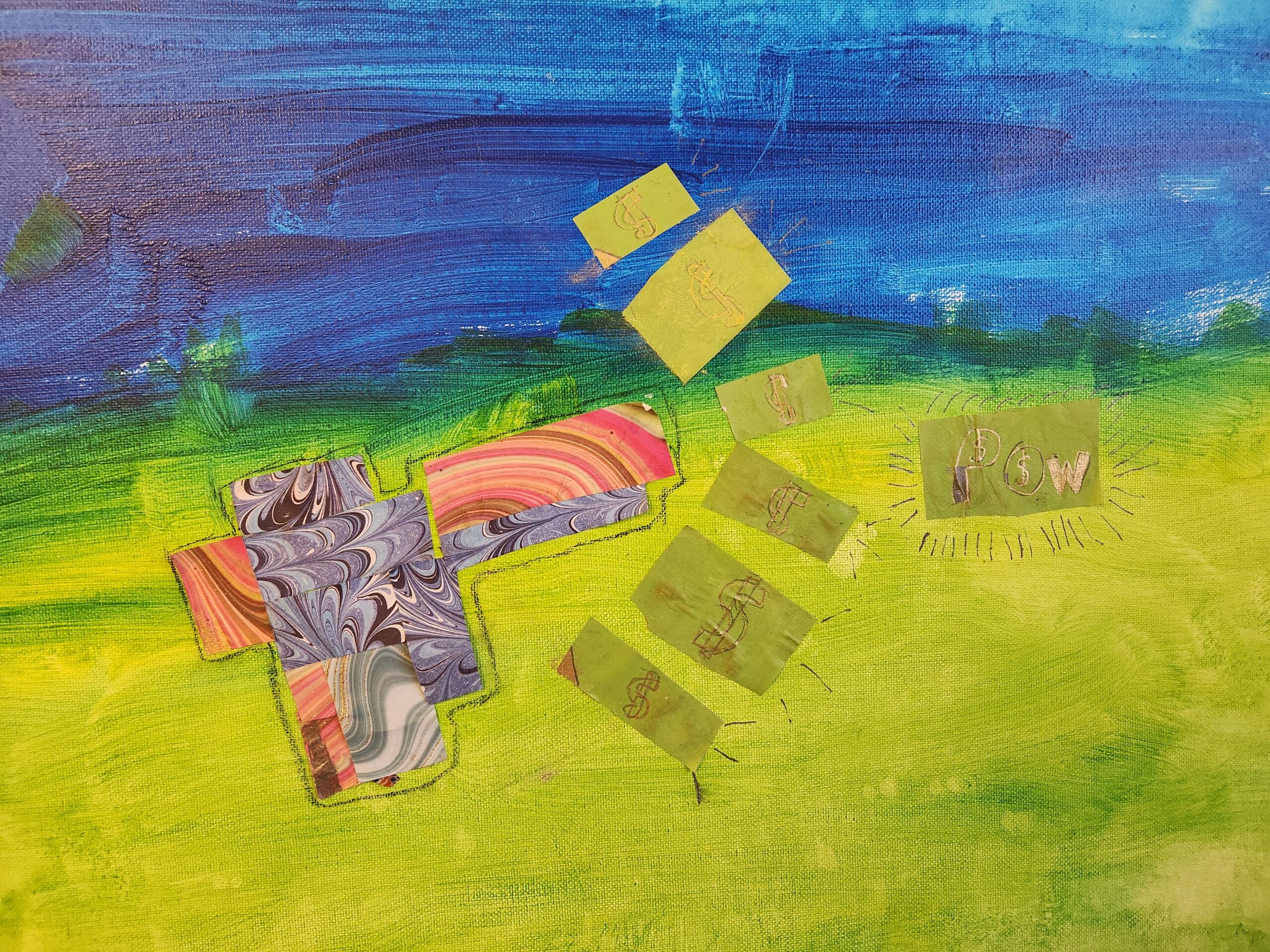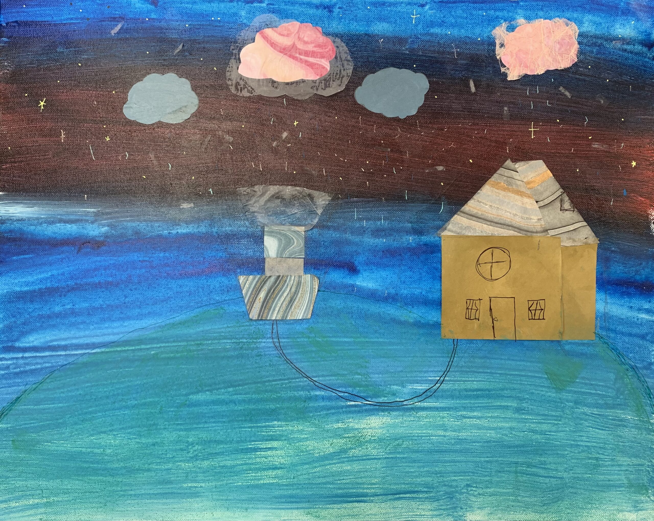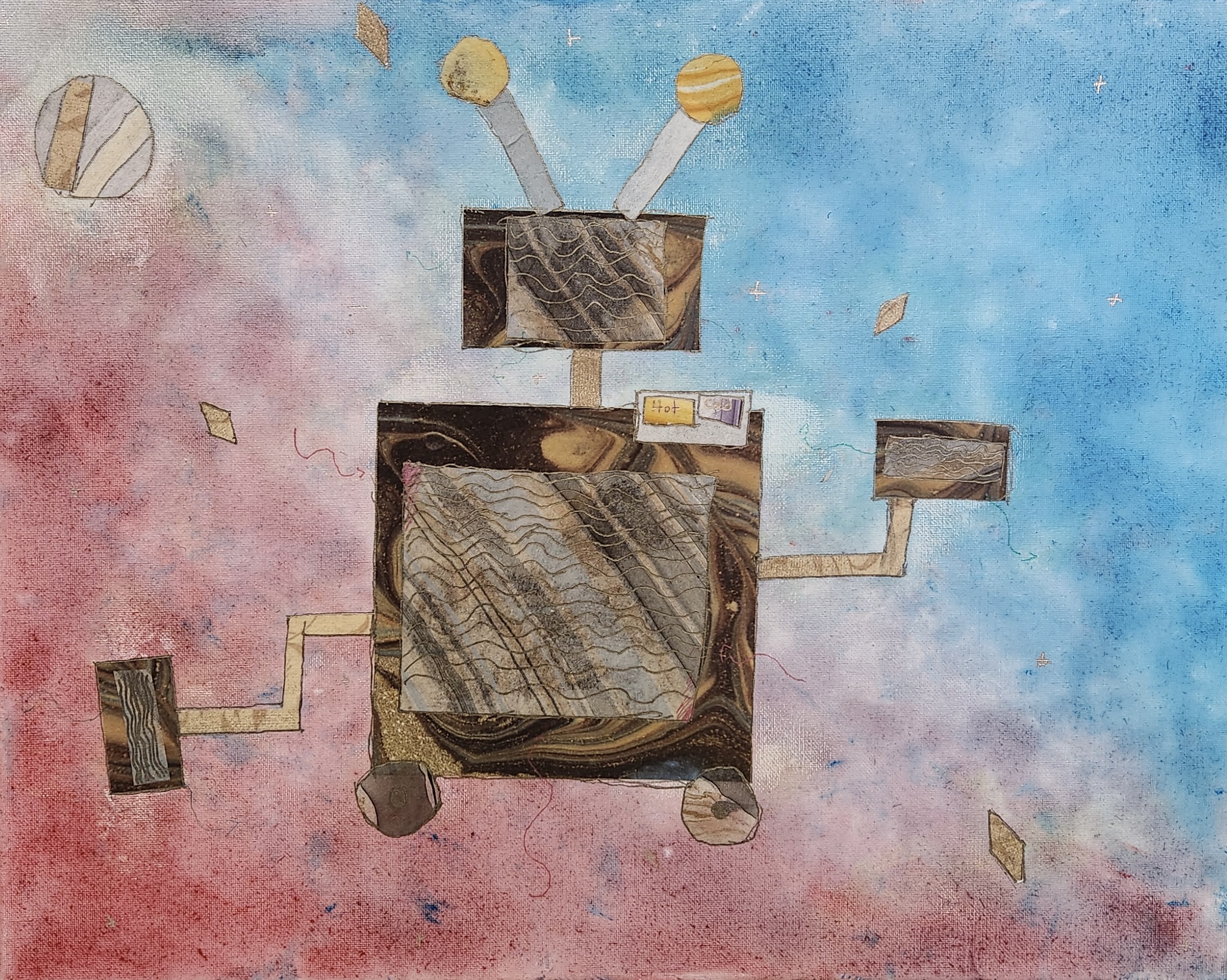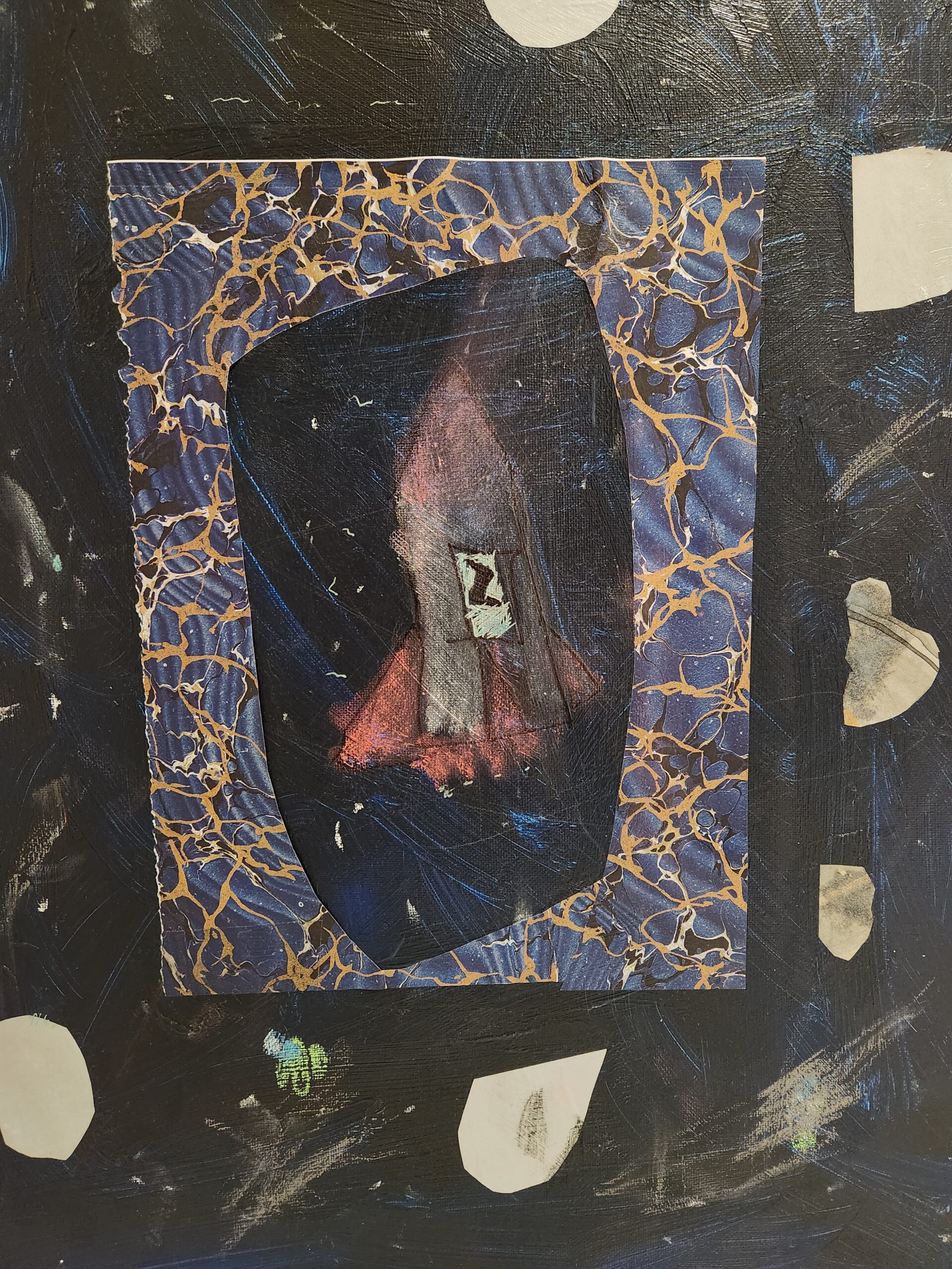 This painting is called “The Space Vase” created on February 14, 2023. The problem shown in my painting is overpopulation. To fix this problem, we created these “spaceships” that travel at the speed of light from one planet to another. My device carries humans from one planet to another with efficiency. It does not run on gas. Instead it runs on wind, kind of like a kite that can travel large distances without a rope