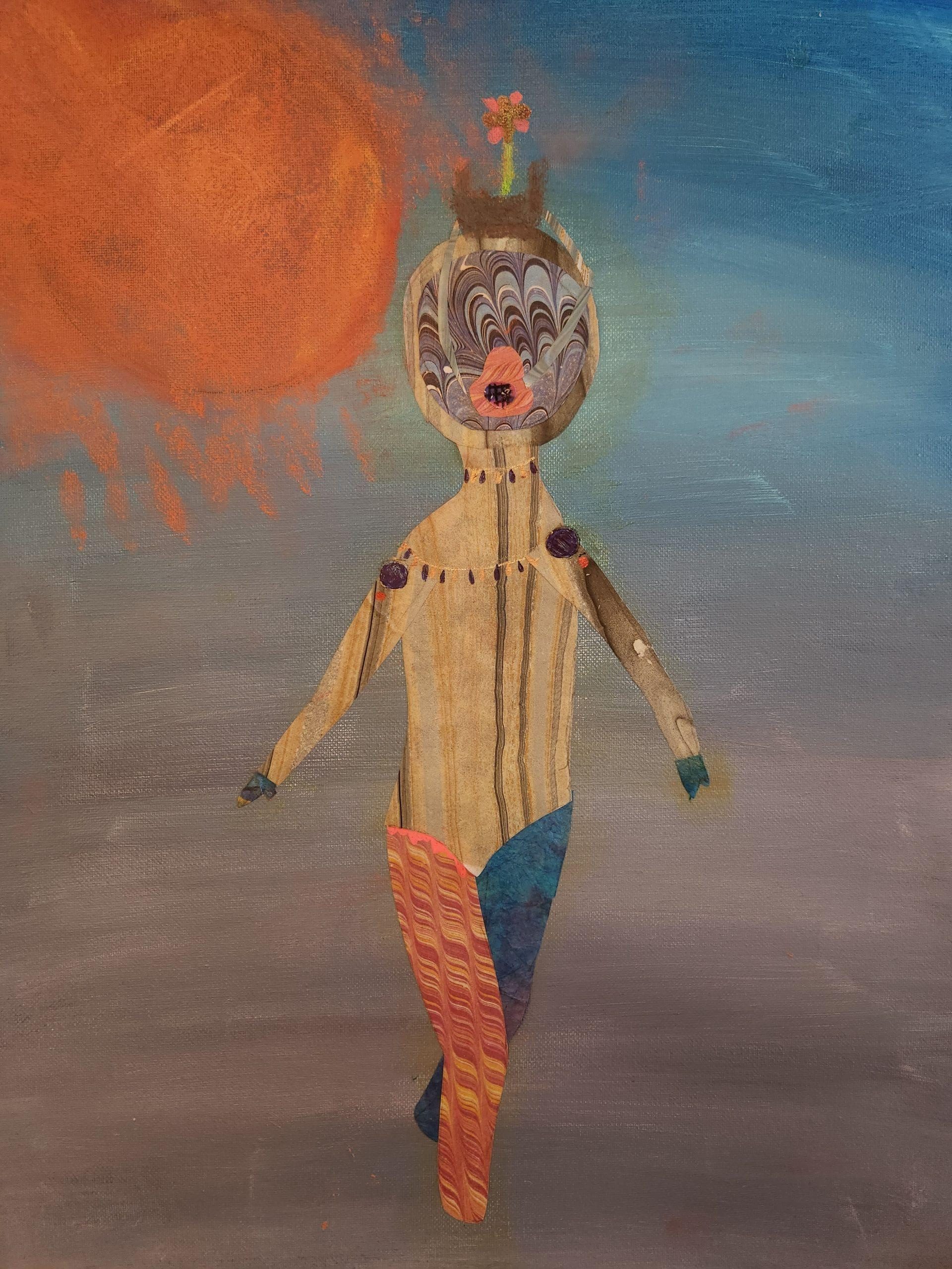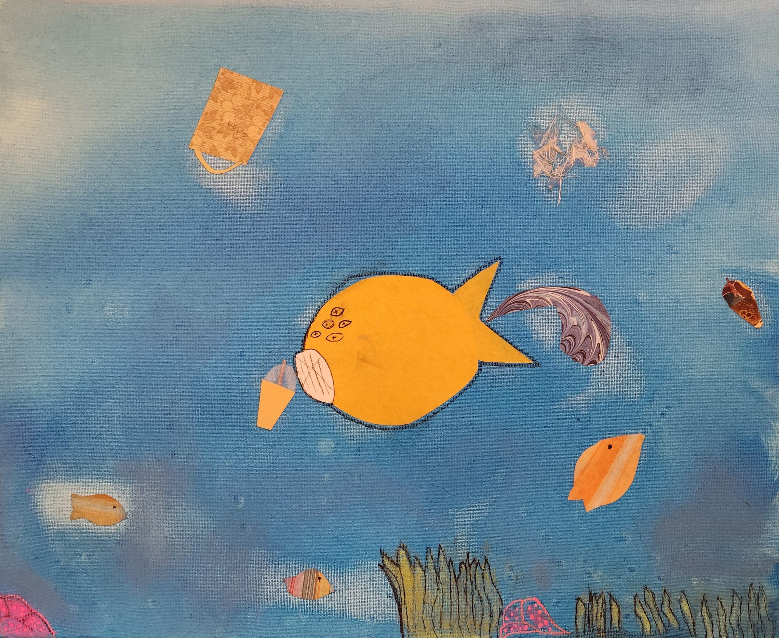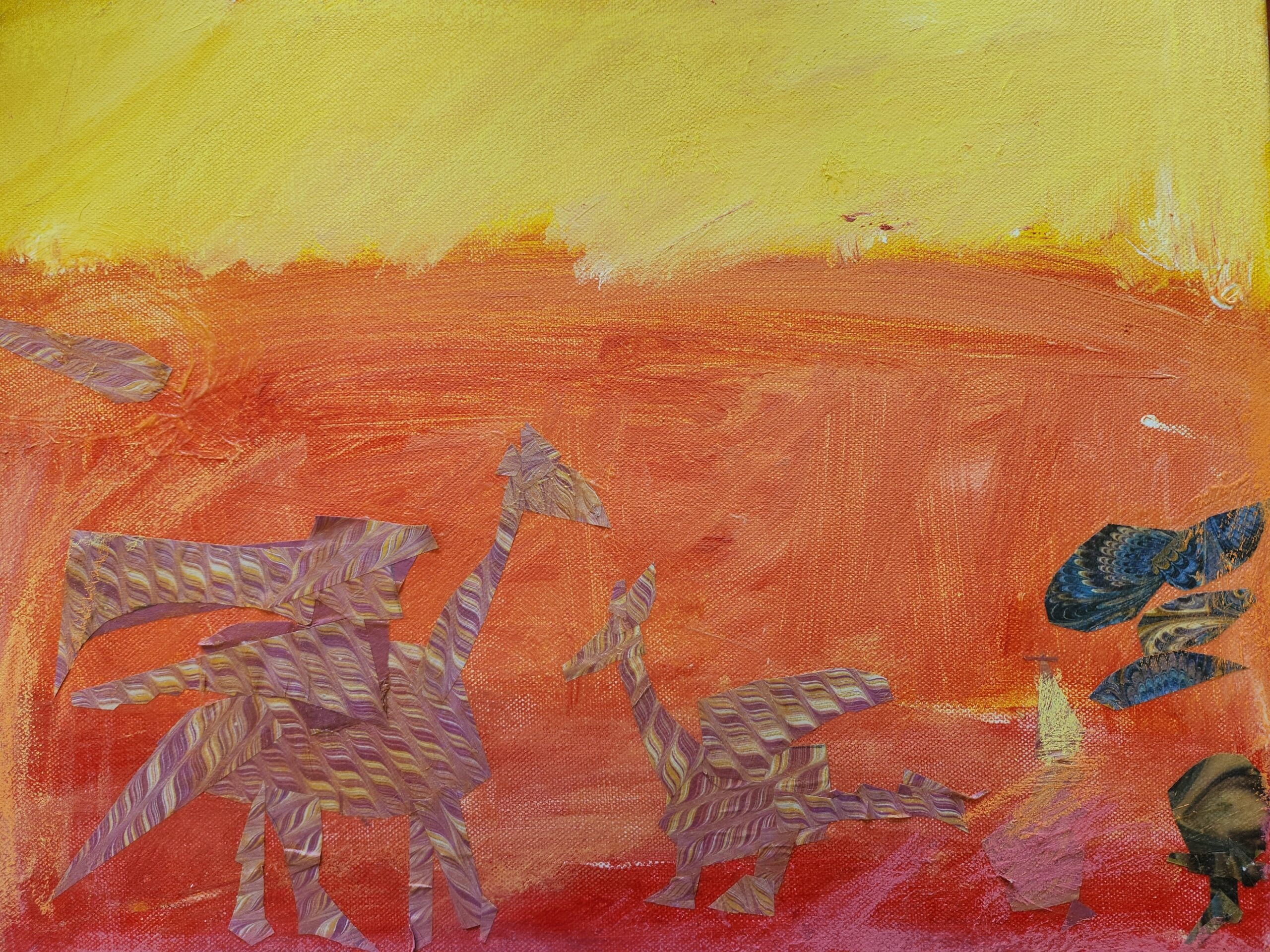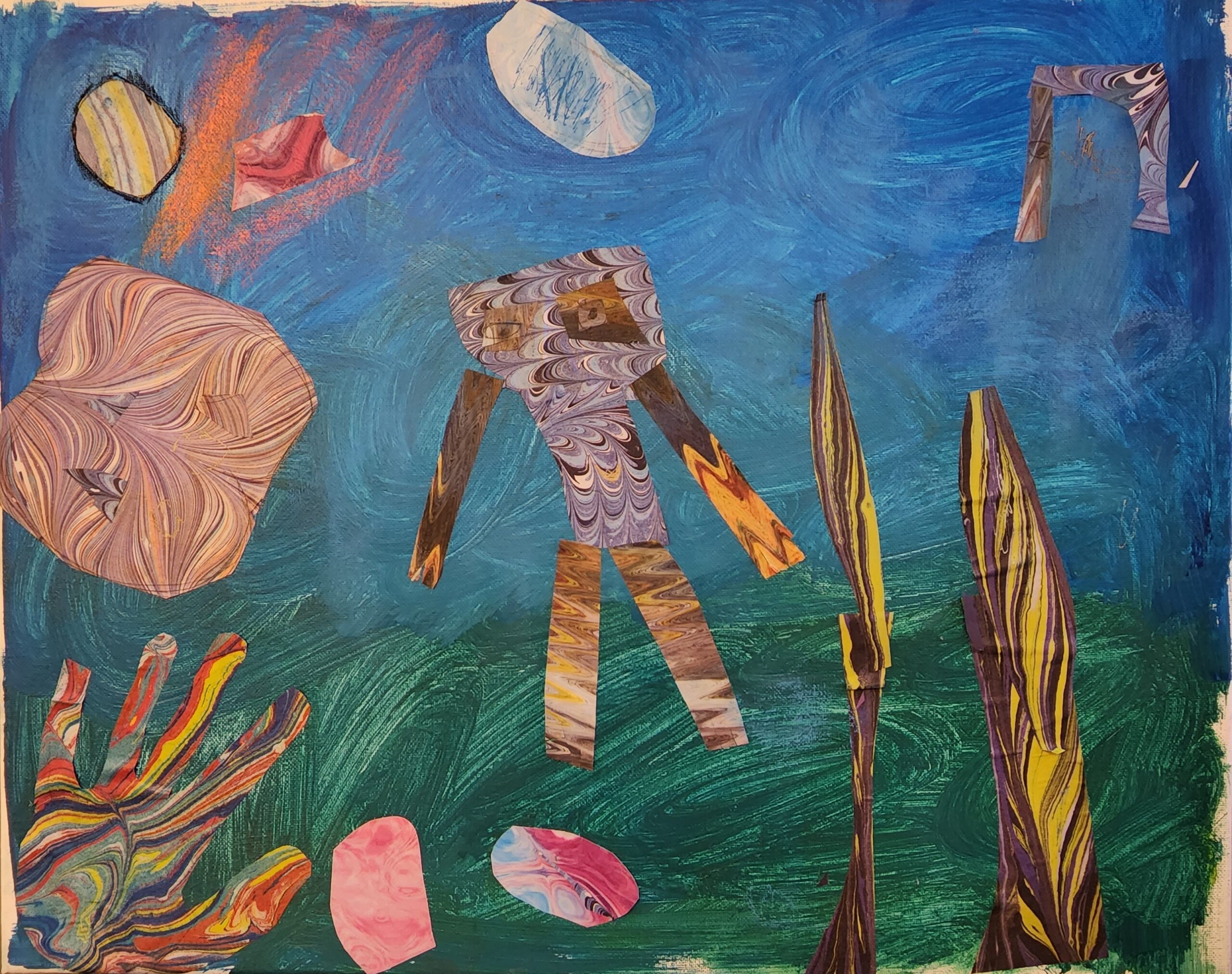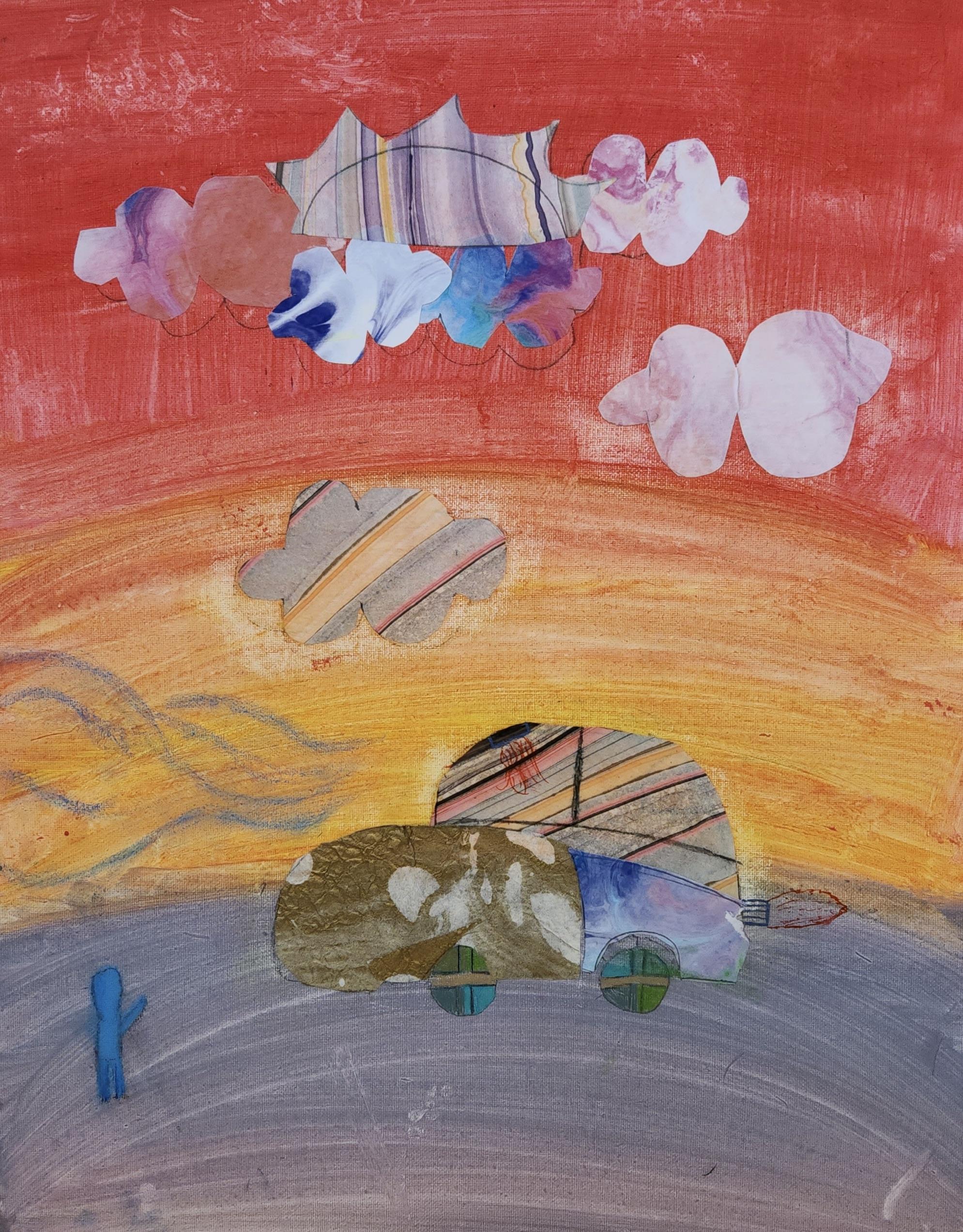 This painting is called “The Space Vase” created on February 14, 2023. The problem shown in my painting is overpopulation. To fix this problem, we created these “spaceships” that travel at the speed of light from one planet to another. My device carries humans from one planet to another with efficiency. It does not run on gas. Instead it runs on wind, kind of like a kite that can travel large distances without a rope