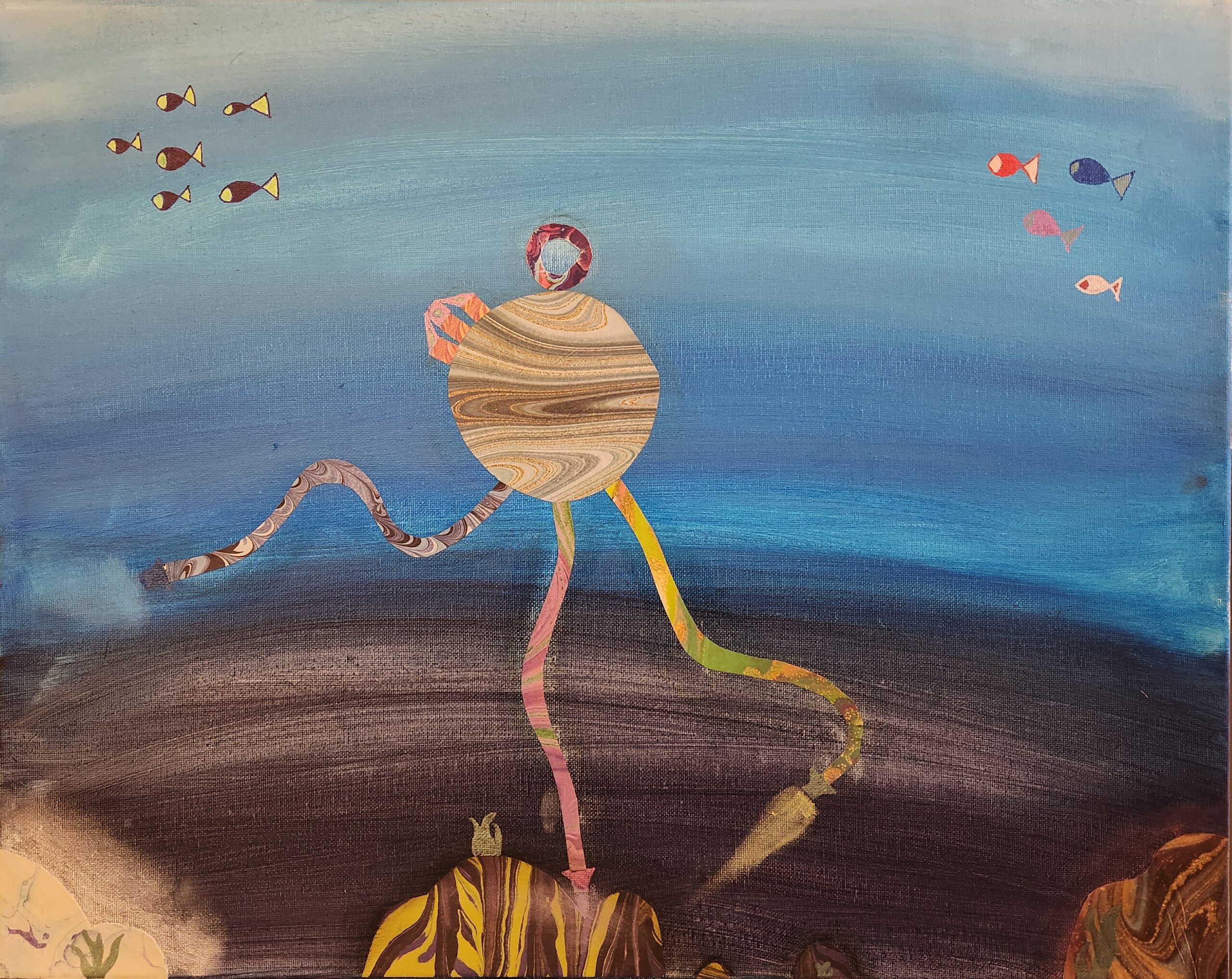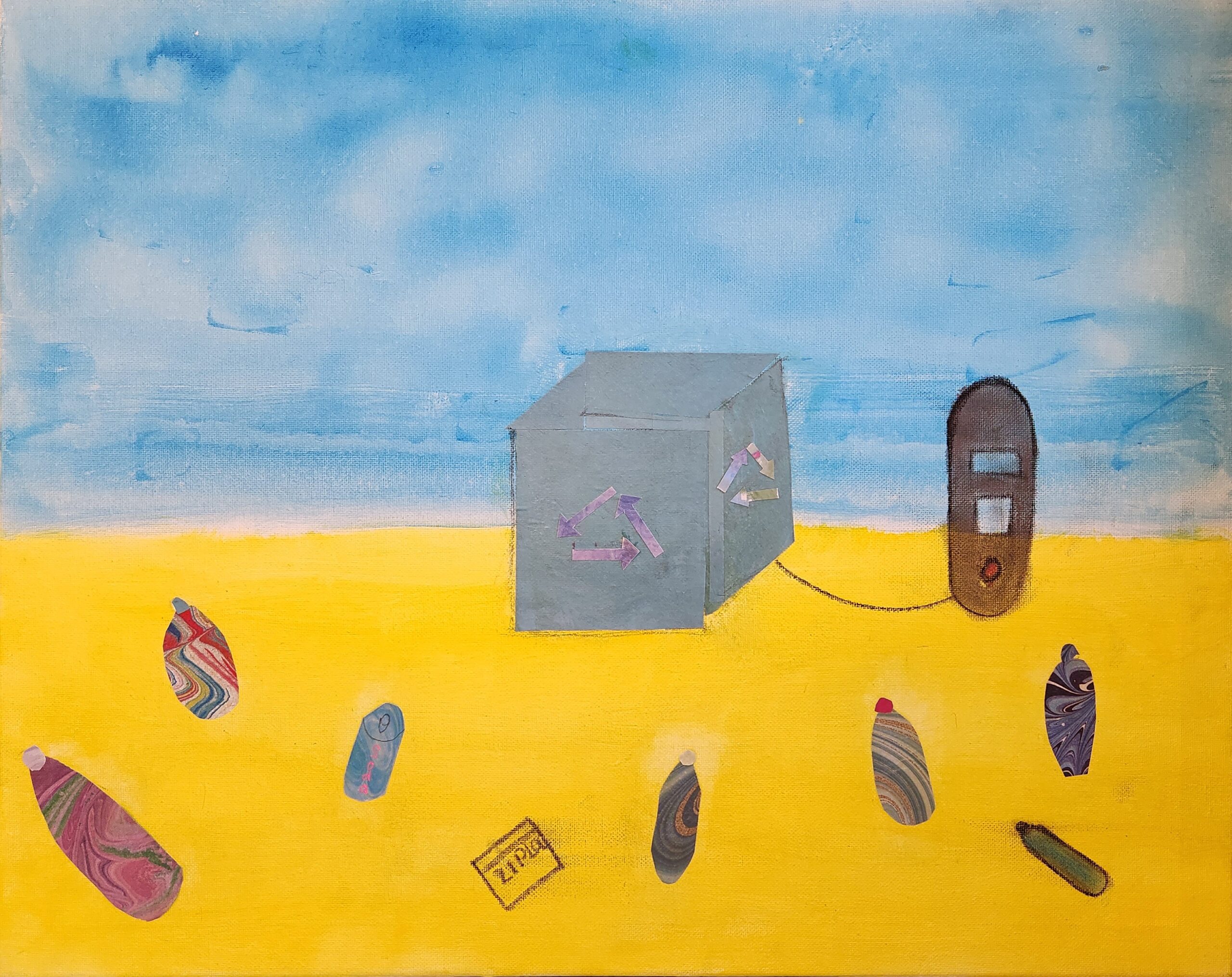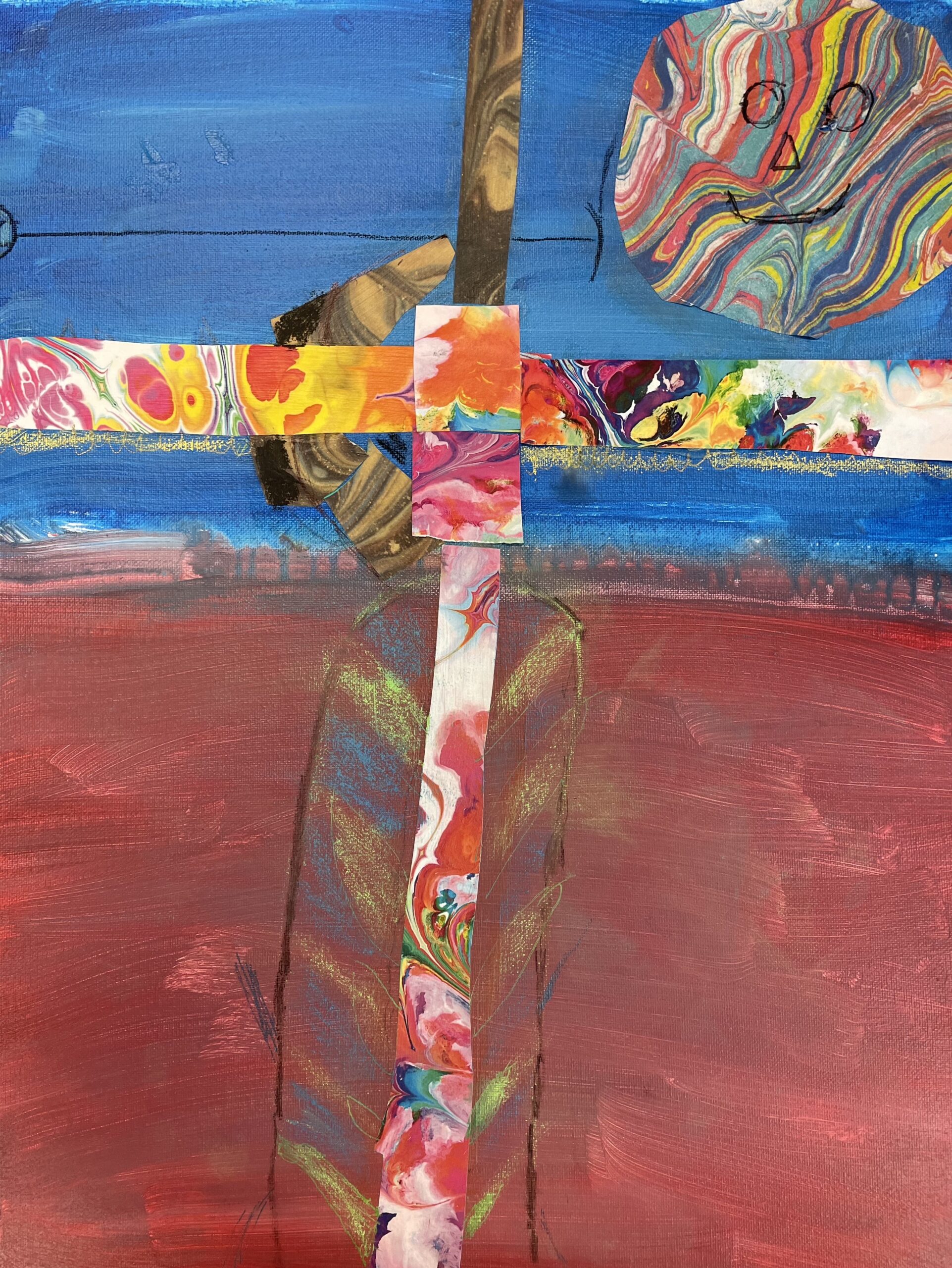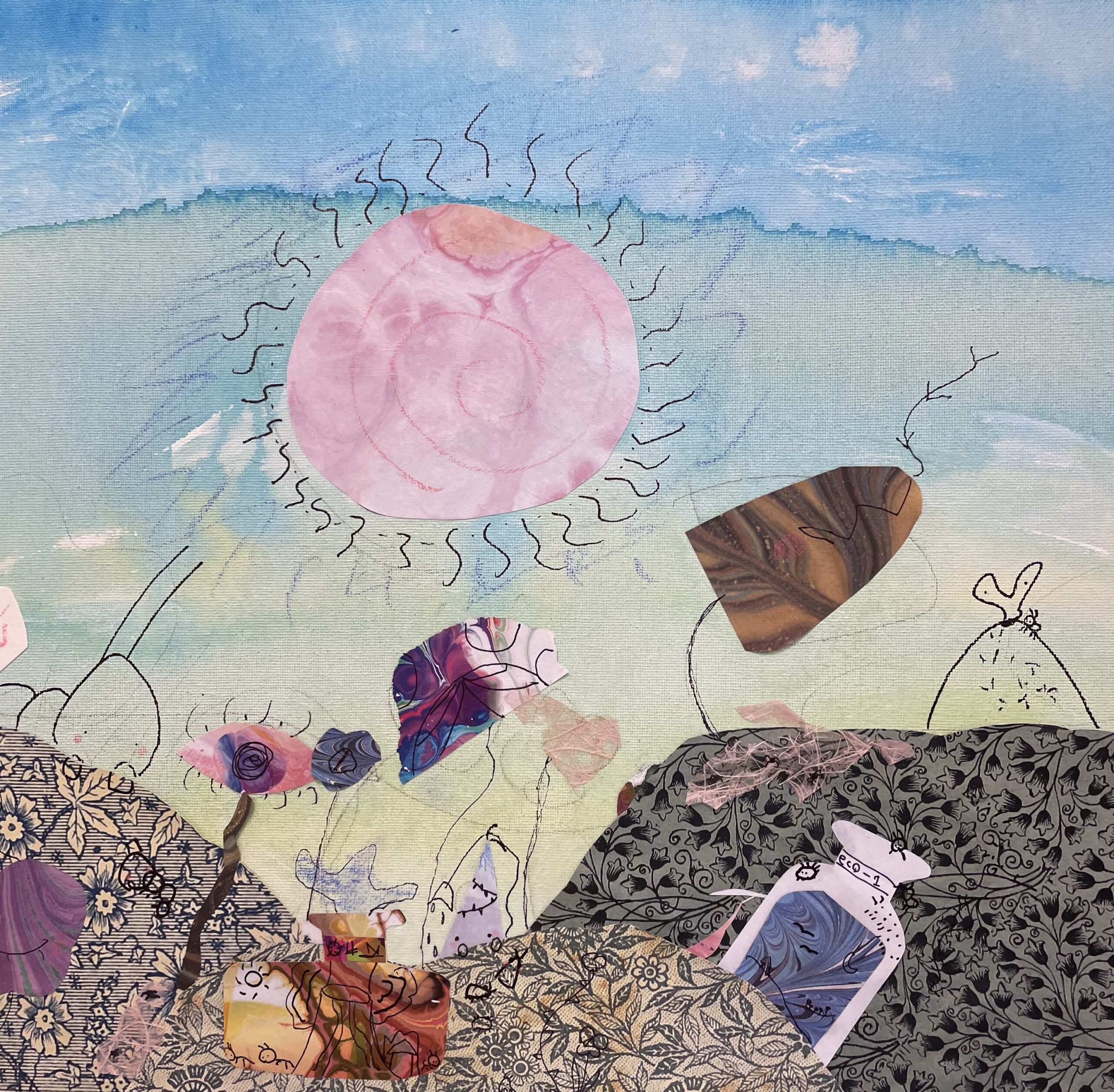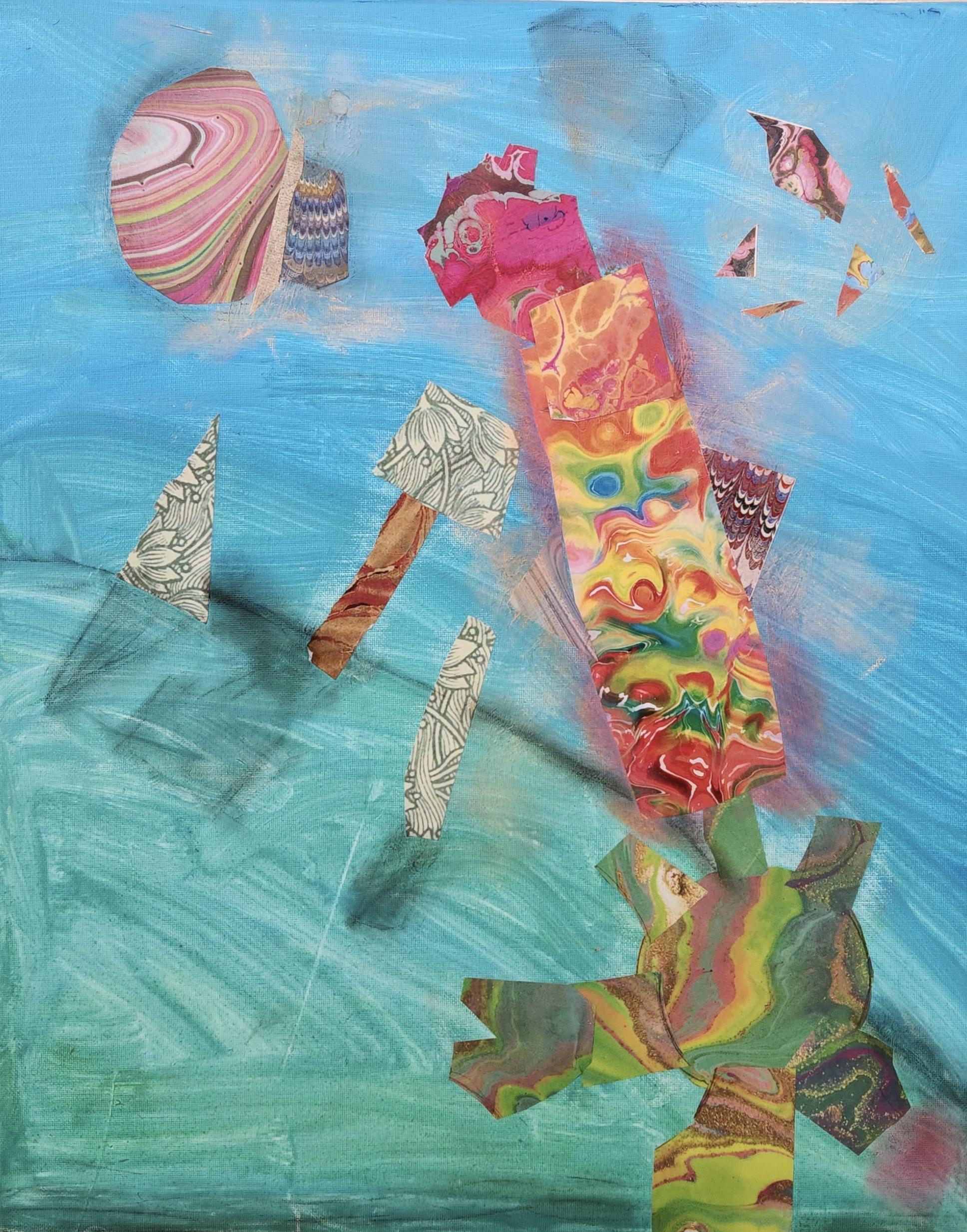 This painting is called “The Space Vase” created on February 14, 2023. The problem shown in my painting is overpopulation. To fix this problem, we created these “spaceships” that travel at the speed of light from one planet to another. My device carries humans from one planet to another with efficiency. It does not run on gas. Instead it runs on wind, kind of like a kite that can travel large distances without a rope
