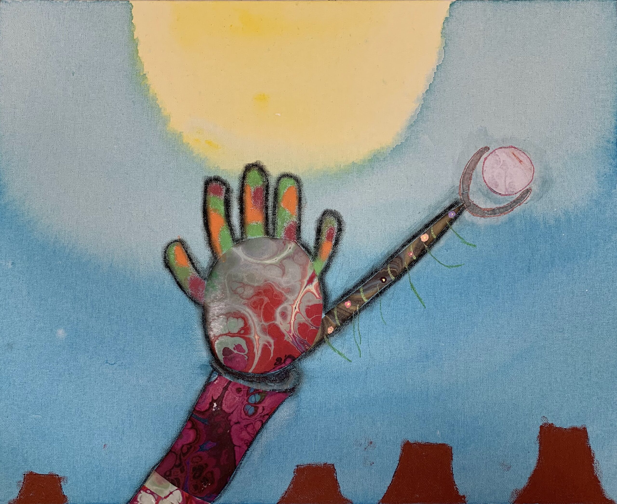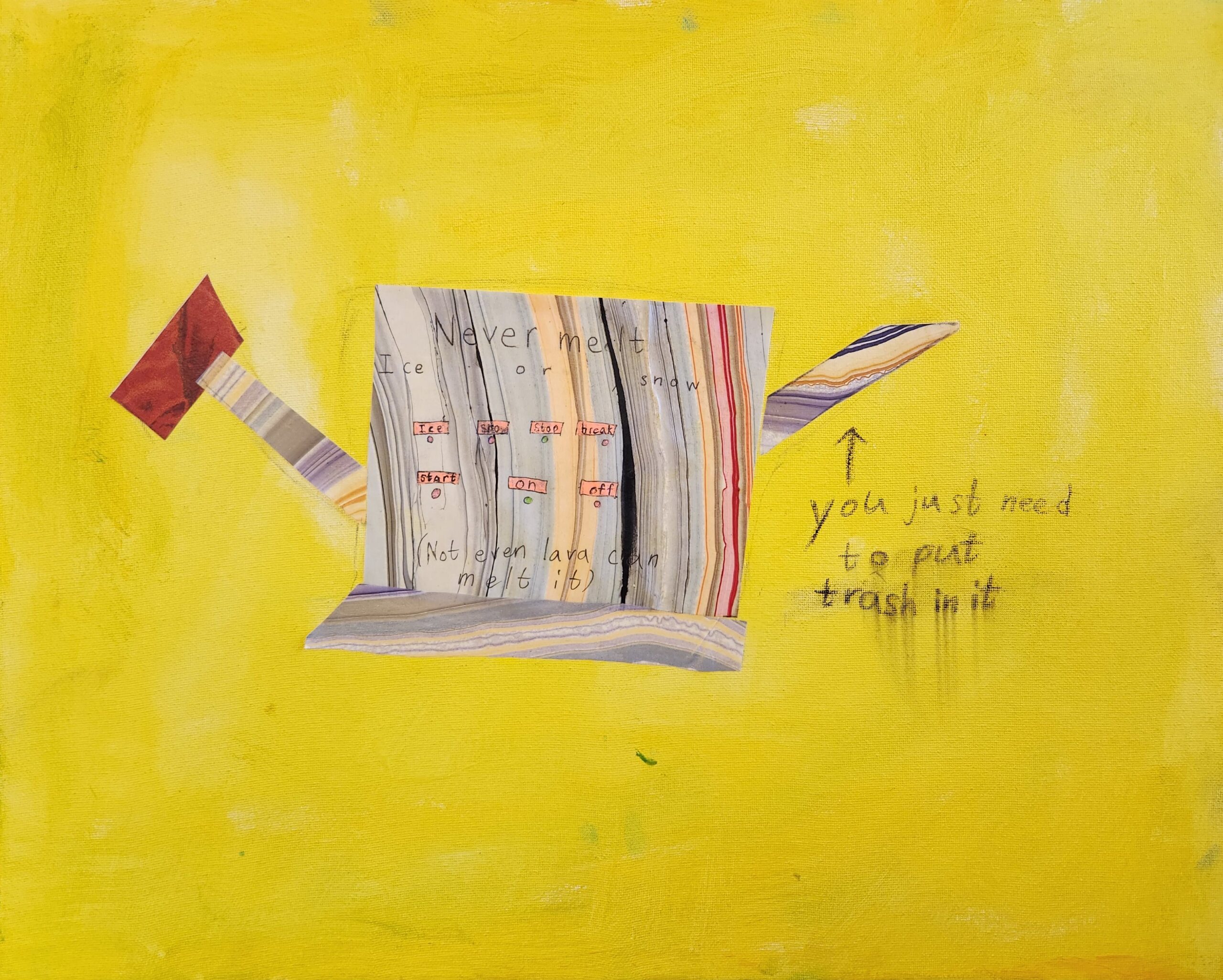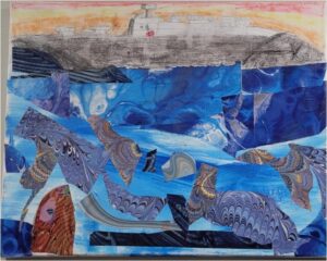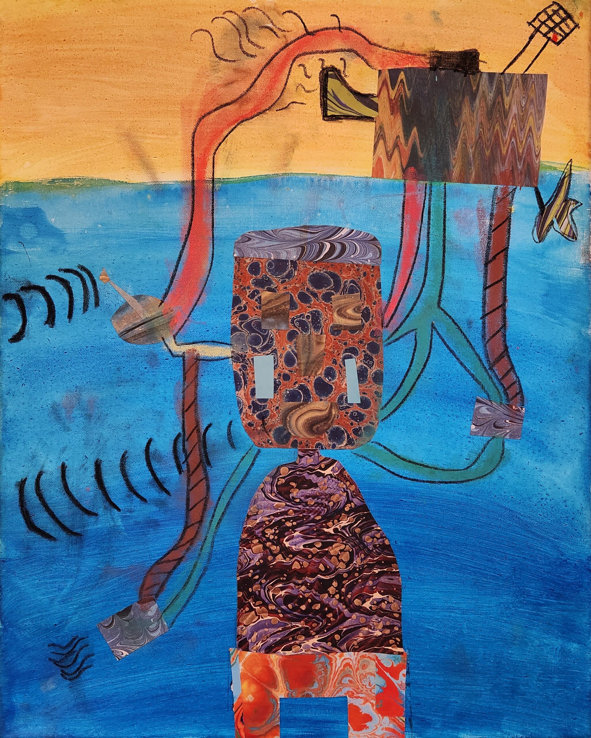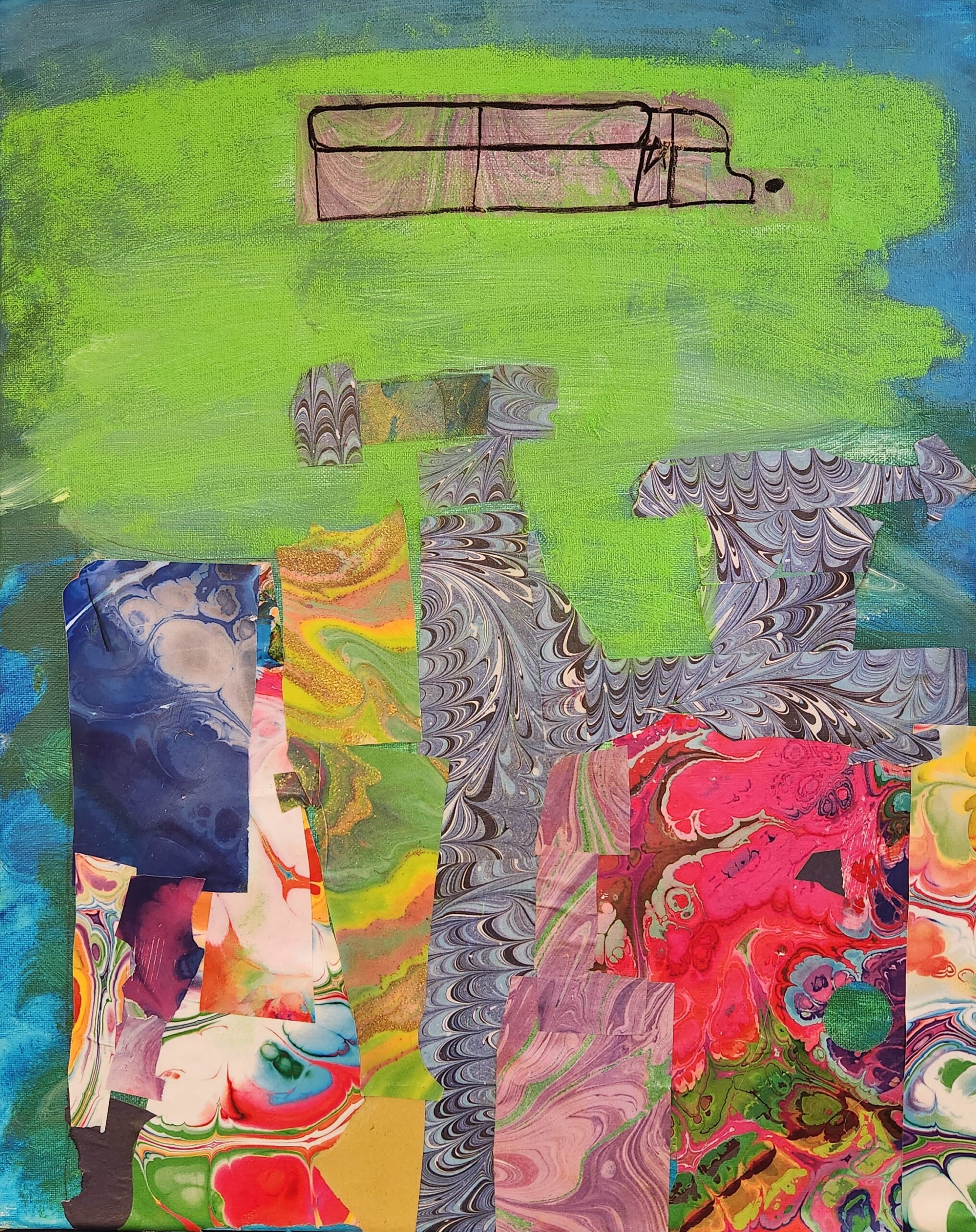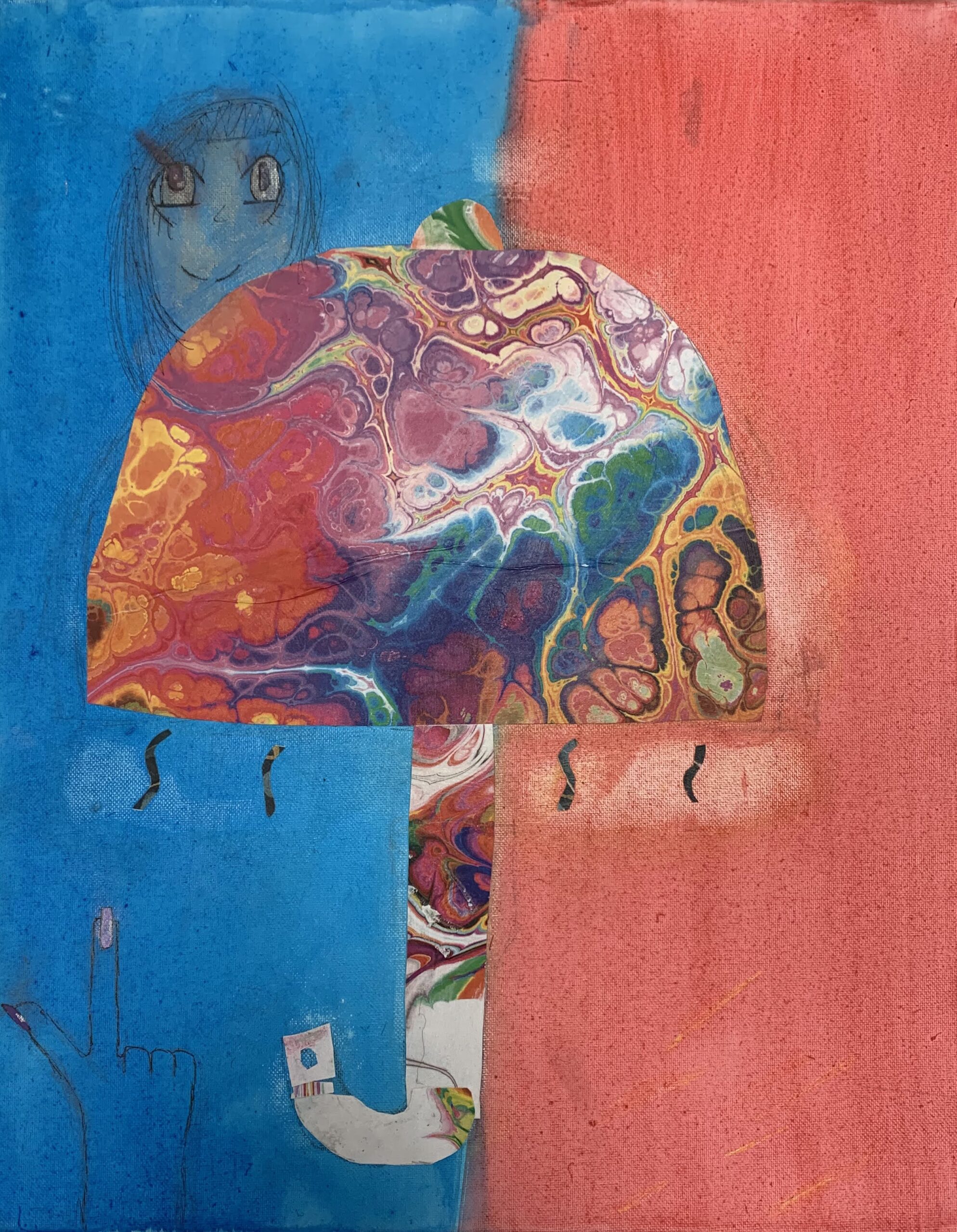 This painting is called “The Space Vase” created on February 14, 2023. The problem shown in my painting is overpopulation. To fix this problem, we created these “spaceships” that travel at the speed of light from one planet to another. My device carries humans from one planet to another with efficiency. It does not run on gas. Instead it runs on wind, kind of like a kite that can travel large distances without a rope