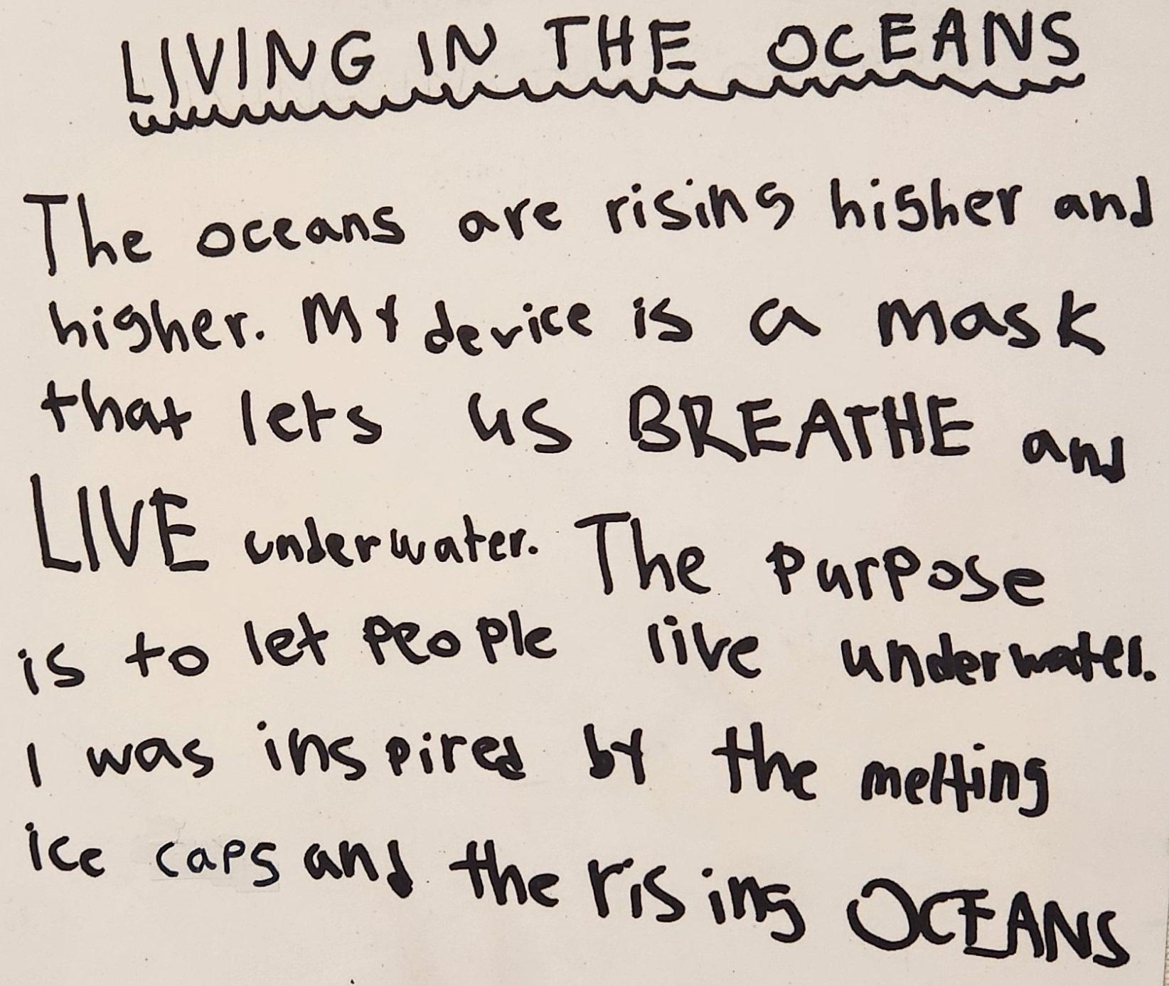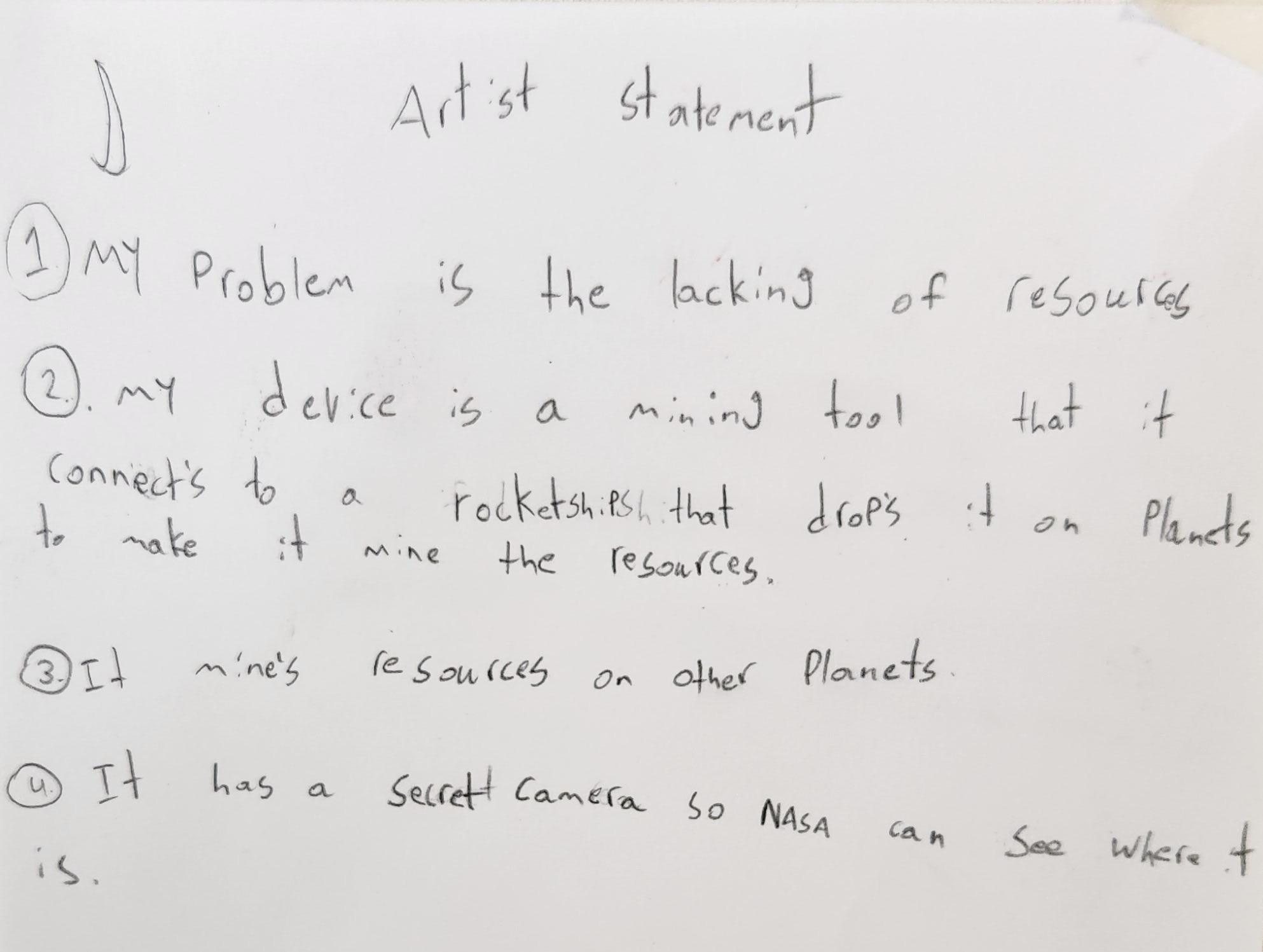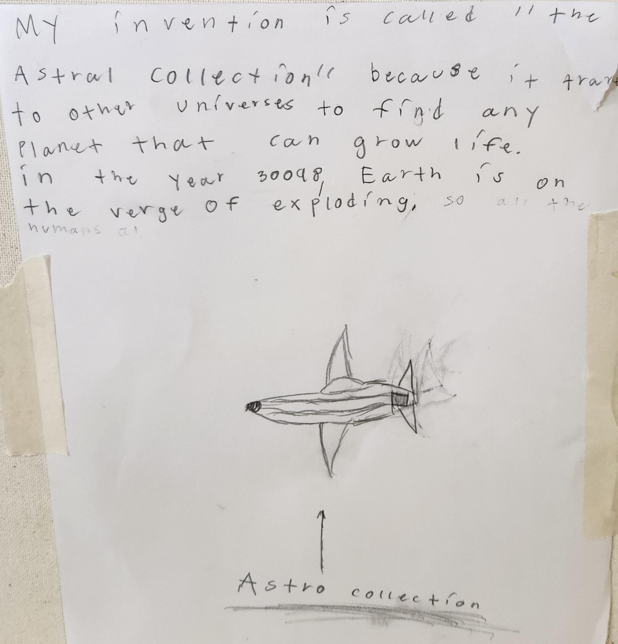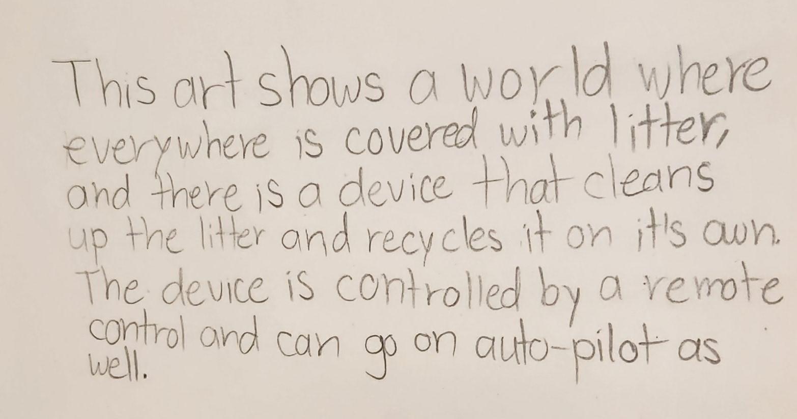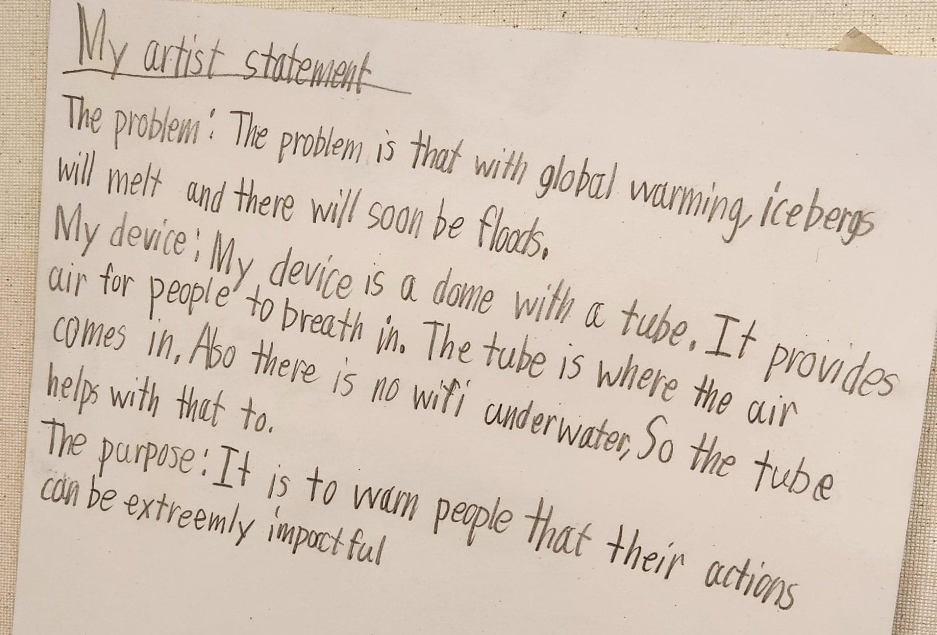Artwork created by participants during the program can be seen below. The project encouraged students to look closely at the artwork of contemporary artist Rajni Perera and reflect on her visions of imagined futures. Students were asked to create a device that could help humanity thrive in a future or place facing environmental challenges. Some students have included an artist’s statement to accompany their work, guiding the viewer to a greater understanding of the process behind their creation.