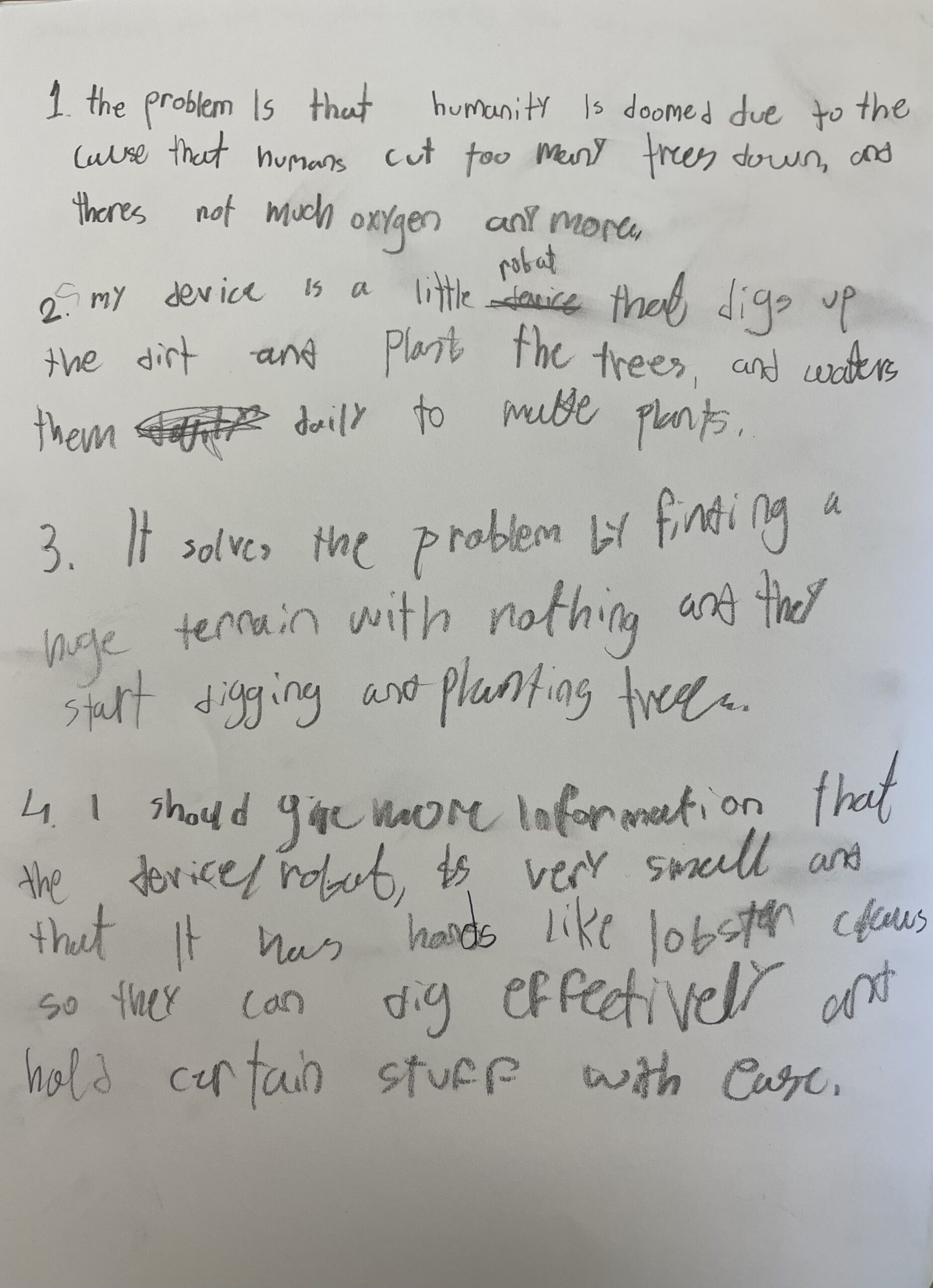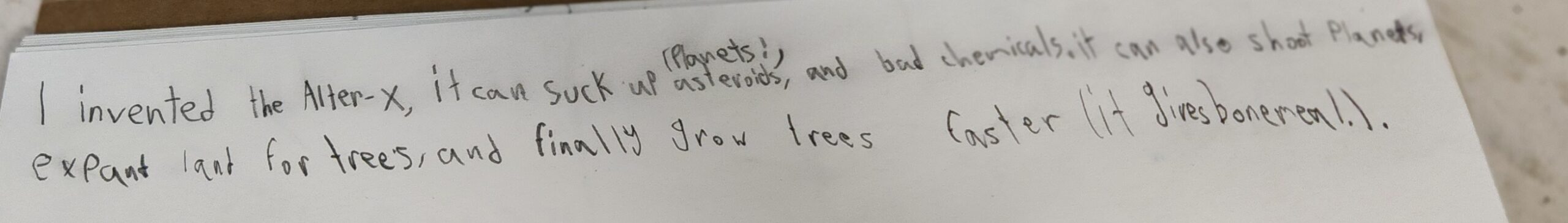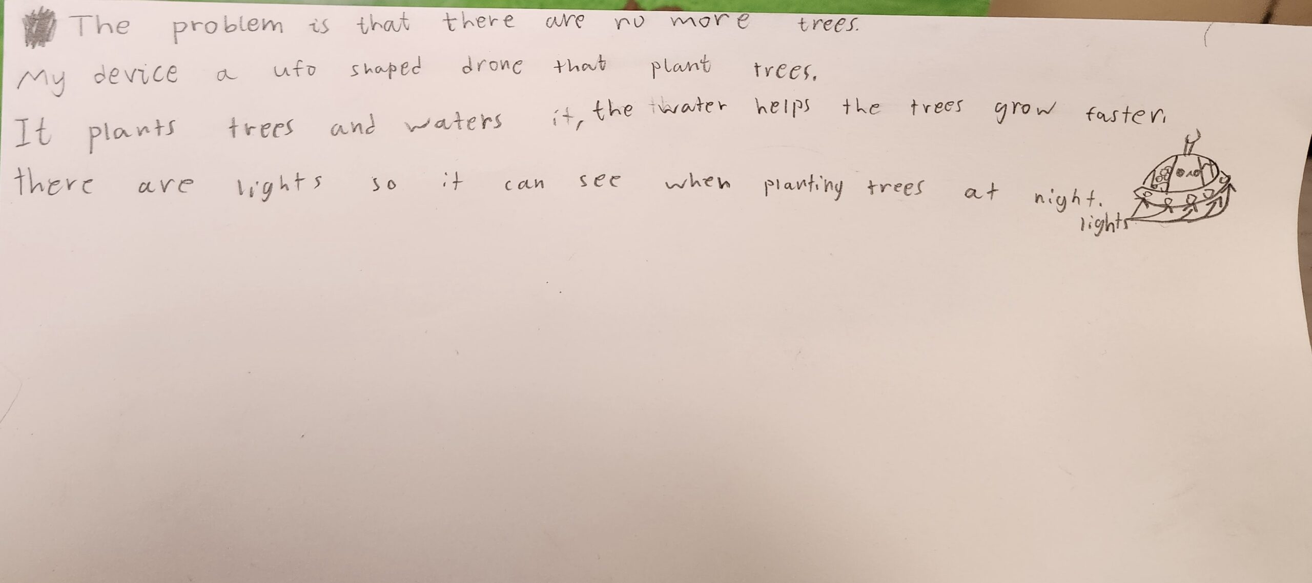 Lately, people have been cutting a lot of trees. My invention is a cloud that flys around the world while dropping tree seeds everywhere! To help the environment, how nice is that? The controller has 4 buttons. The first button is to turn the cloud on. The second button is to turn it off. The third button is to drop the seeds down to plant. The last button is to make it rain after the seeds are dropped.