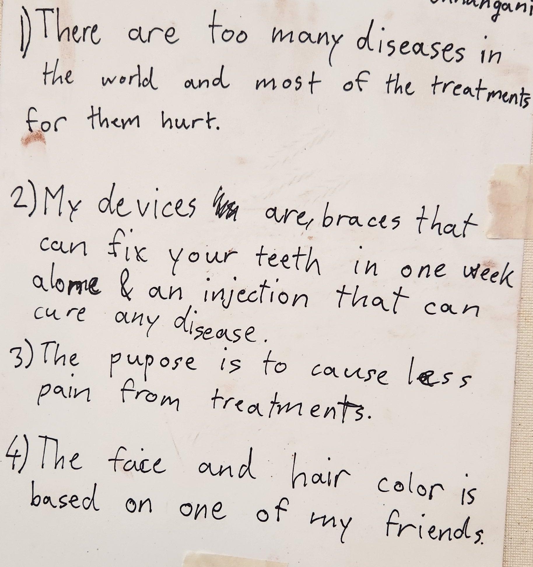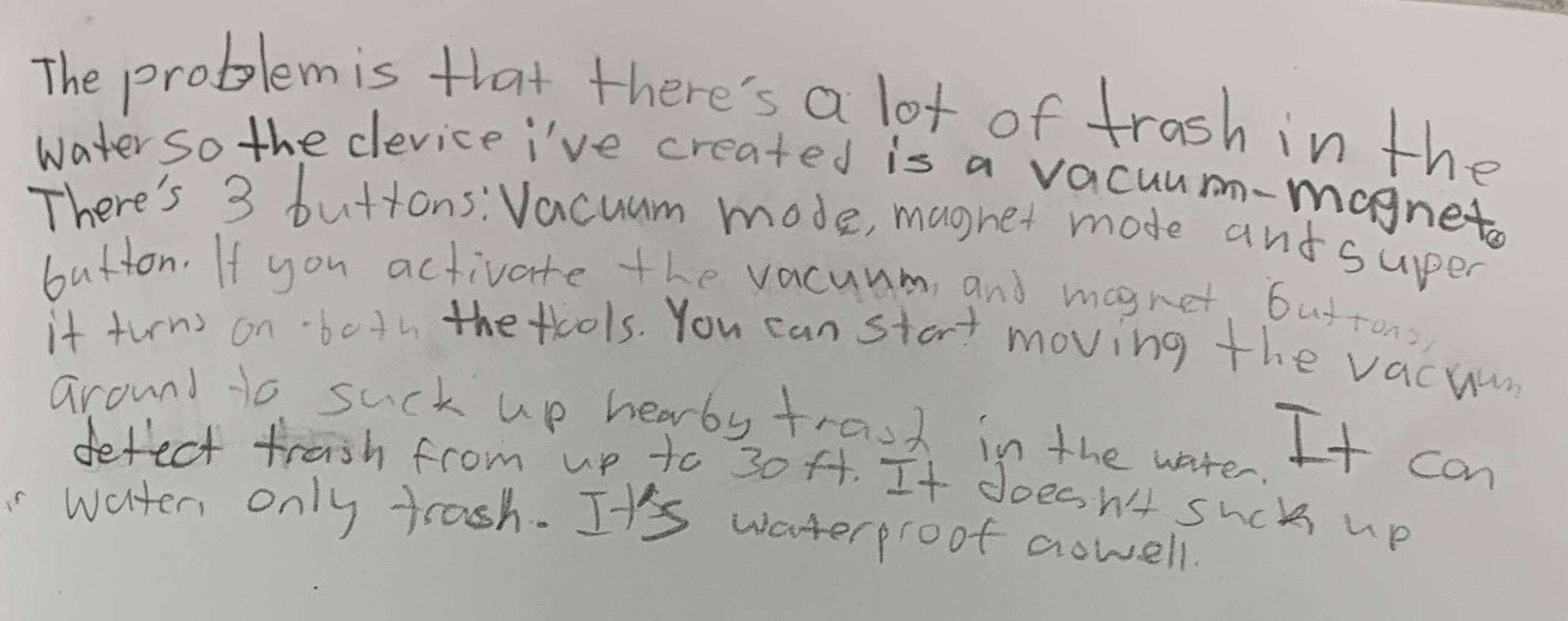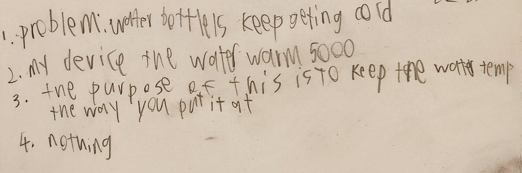 The problem is the water is polluted and there is no fresh water to drink.My device helps to purify the water to change it into fresh water or you can say drinking water.My device solves this problem by having a water filter located inside of it. The way it works is you unscrew the head and add in the water.Wait for 1 minute then press the button on the head when you press the button the fresh water / drinking water will come out of the eyes. (don’t ask why).