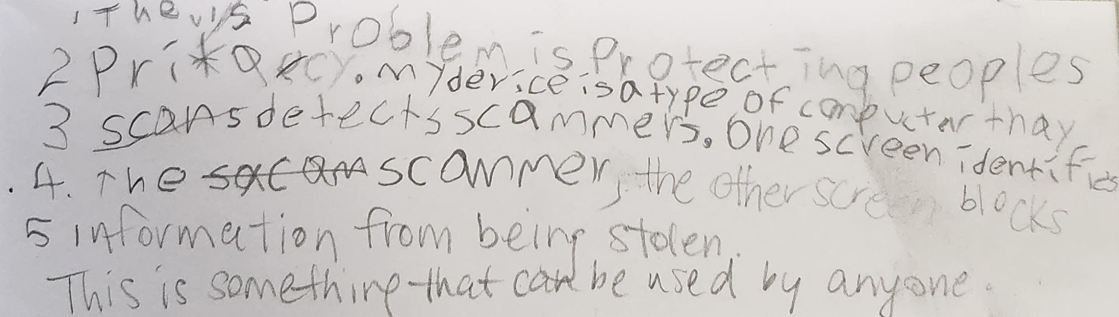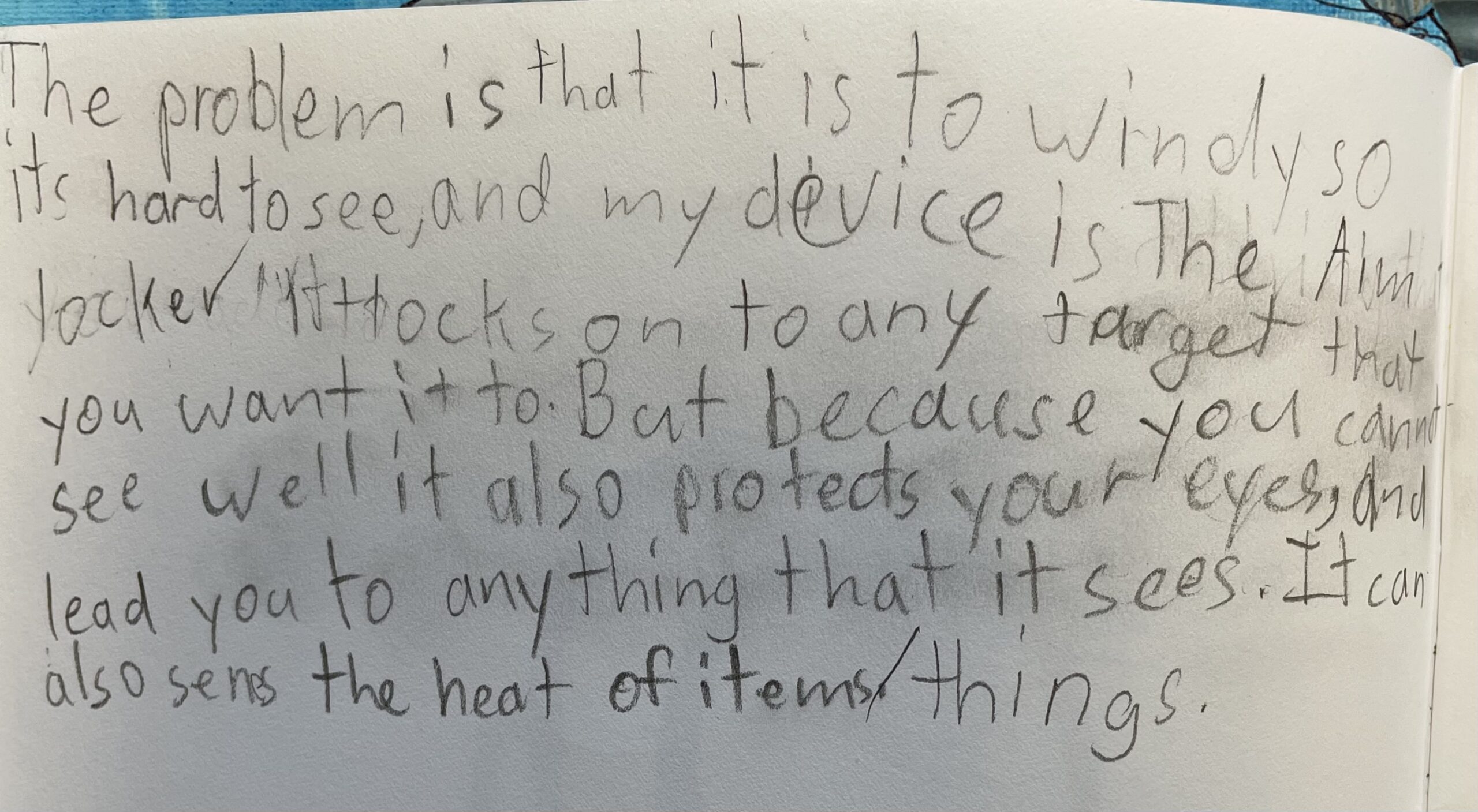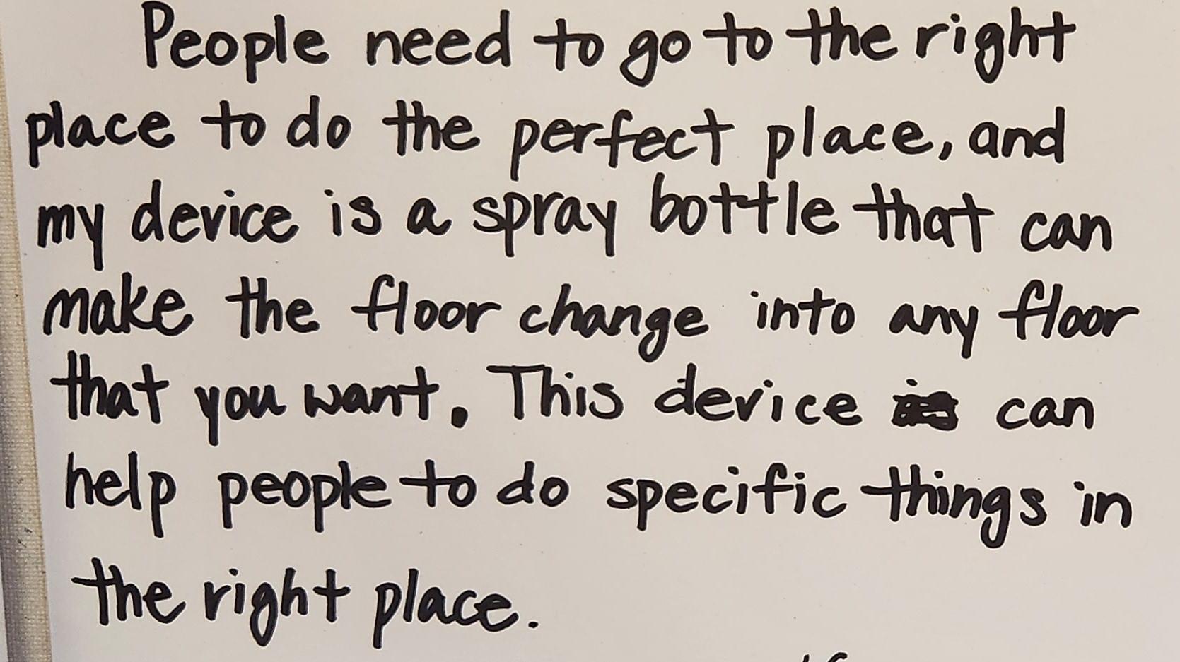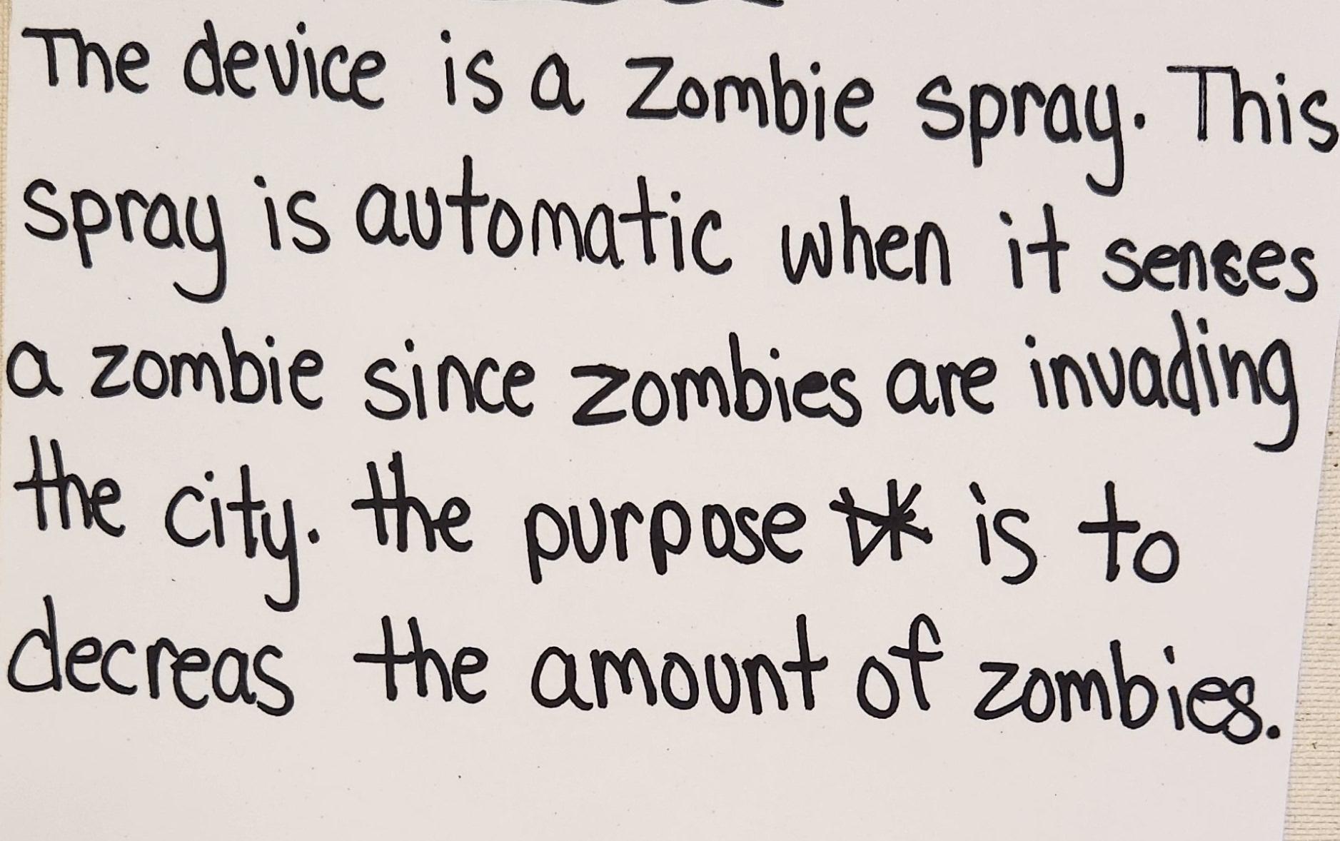 The problem is that bad guys attacks people. My device is a device that can suck up few of the air around you and you can put a bottle of poison in the device and then it combines the poison and air together then the device blows the two combined things and makes the bad guy paralyzed. My device works by pushing the button on top of the device. You don’t need to charge it.