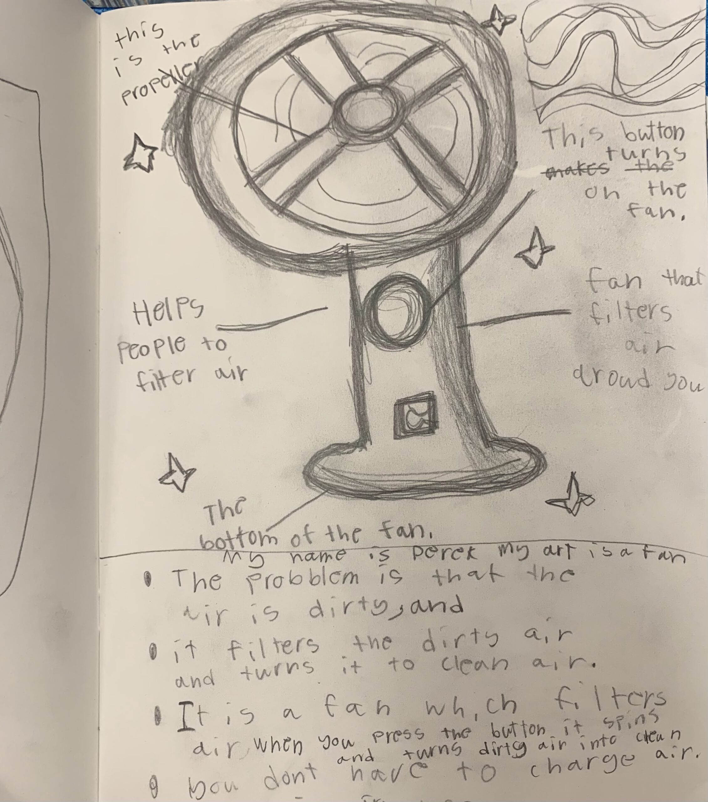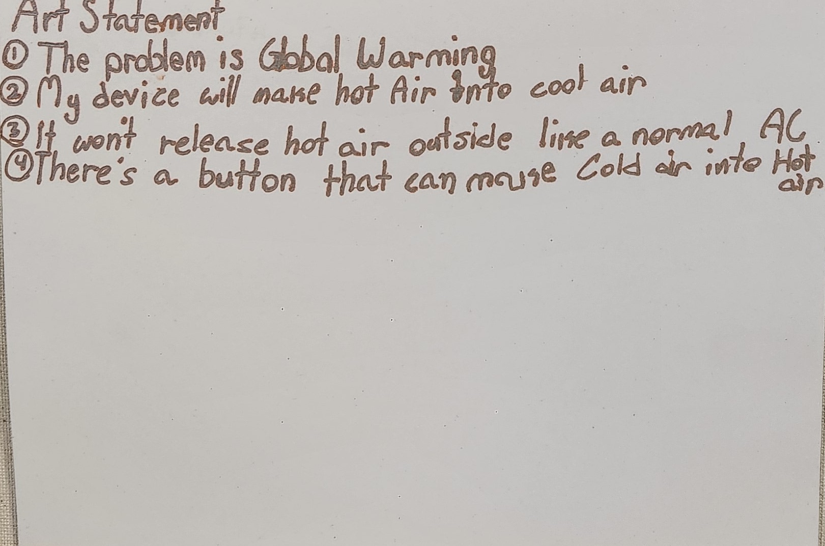 My art piece is a fan. The problem is that the air is dirty and people can’t breathe because it is dirty. The fan filters air when you turn on the button and turns dirty air into clean air, It does not require any batteries or charging.