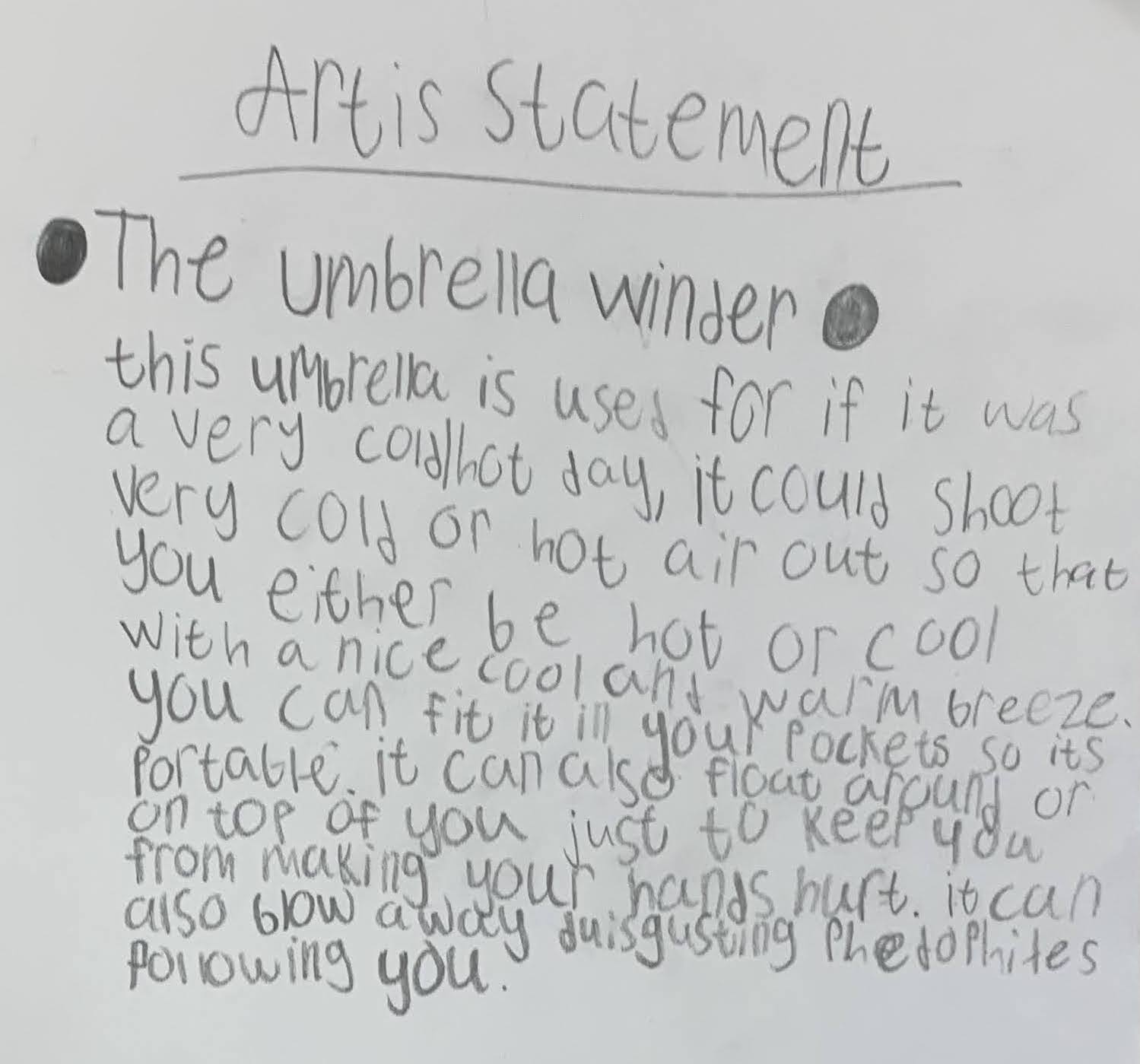 For my artist statement I’ve created an umbrella. The problem is the acid rain, the rain can cause very annoying problems that can harm you or someone, so i created my device, it’s an umbrella that can protect you, and others which can help save people from the rain.