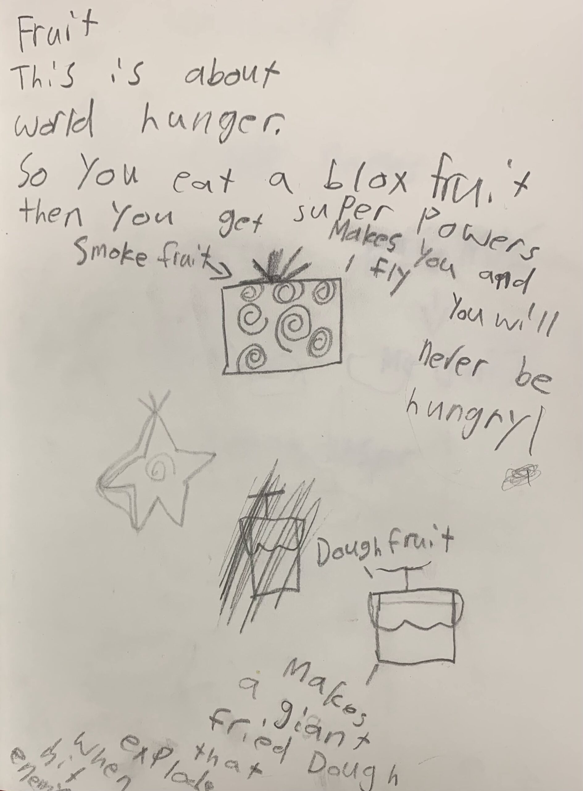 This is about world hunger. So you eat a blox fruit then you get super powers and you’ll never be hungry! Dough fruit makes a giant fried dough that explodes.